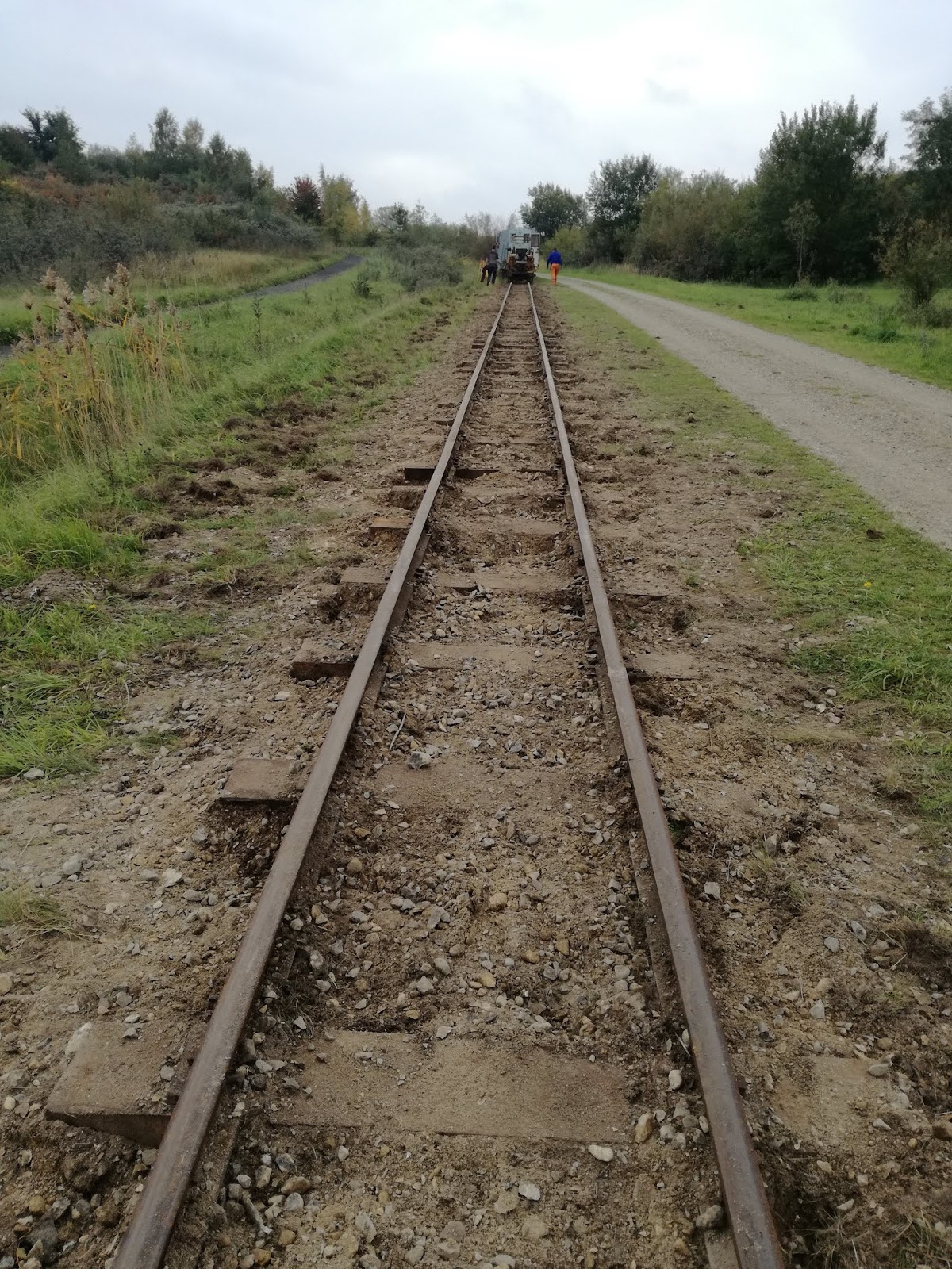 Med første strækning færdig var det blevet tid til frokostpause for arbejdsholdet. Efter pausen blev vejret mere solrigt. Adskillige besøgende i Hedeland passerede os på stien ved siden af banen, hilste og sludrede lidt med os – når de kunne for stoppemaskinens larm. Flere vidste at banen skulle være klar til efterårstogene.