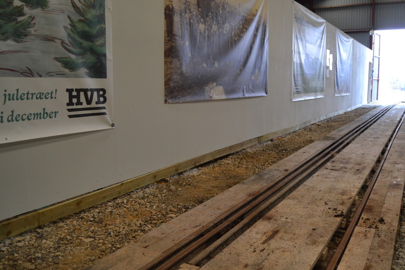 Desværre rakte vores beholdning af nøddesten ikke til at skabe et helt jævnt underlag mellem væg og bræddegulv. Det må vi udbedre en anden dag. Efter at have kørt tipvognene på plads i hallen på Brandhøj, satte vi lokomotiverne på plads igen.