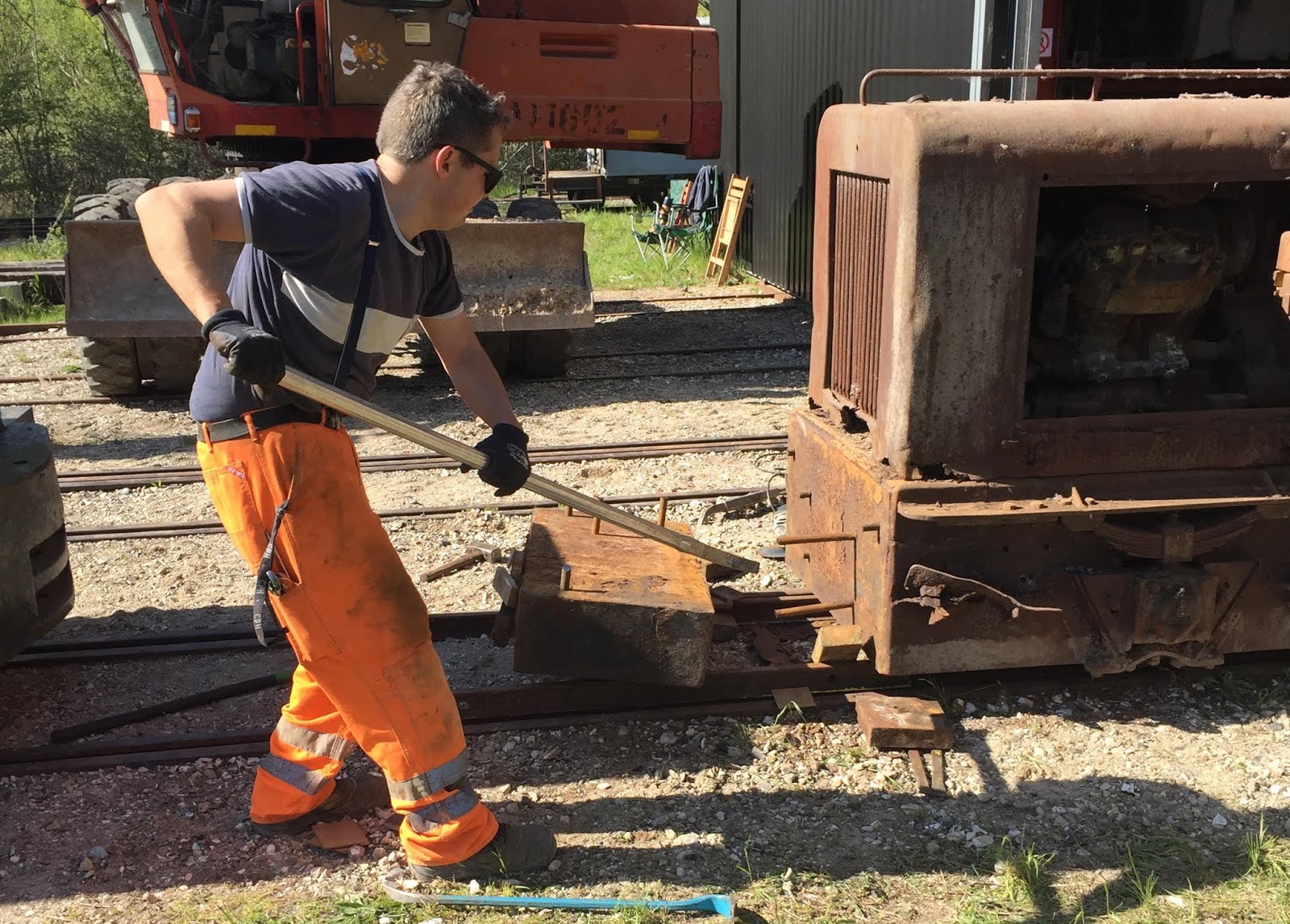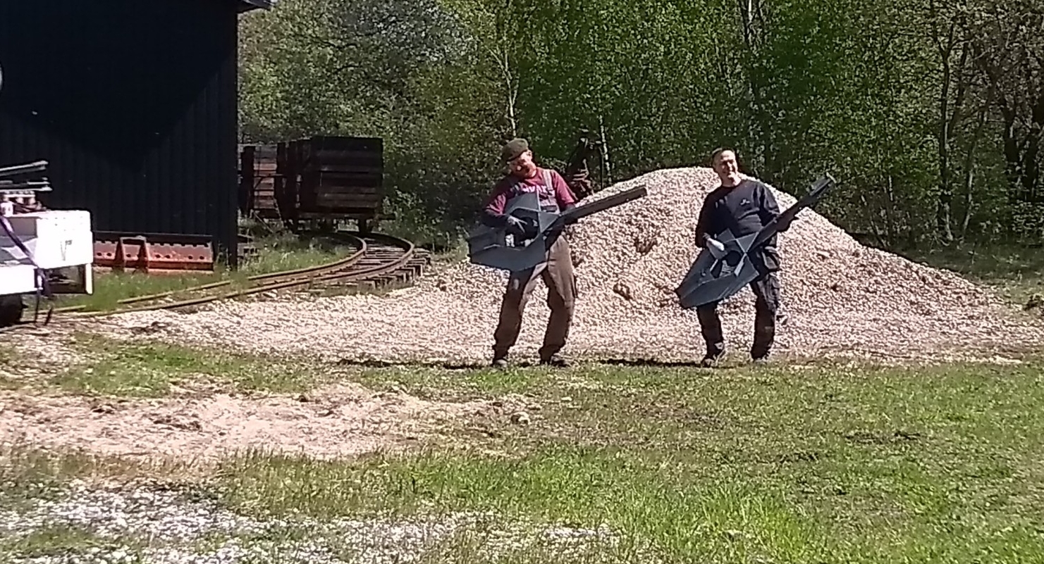 | Vi er klar til at løfte Pedershåb-lokomotivet af sporet. Opstillet på svellerne til højre er det nu klar til afhentning. I forgrunden vores nye Schöma-lokomotiv fra Faxe Jernbane. |