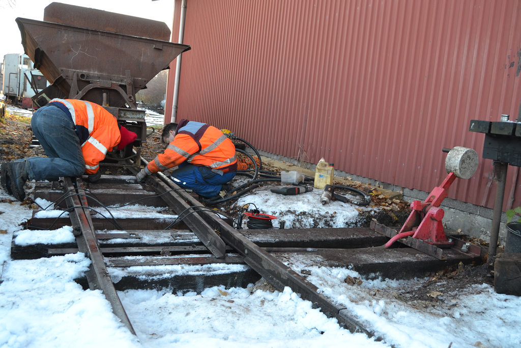 Der blev også monteret et par stag til at holde tungepartiet på plads, men det lykkedes ikke at fortsætte ballasteringen af sporskiftet, da vores ballastvogne med grus var frosset. Vi kastede os derfor over et andet projekt, nemlig at etablere en kort stump 600mm spor i vognhallen, således at vi kan få rykket rundt på de sidste enheder i hallen. Sporarbejdet blev afsluttet, så nu venter kun selve flytteopgaven.
