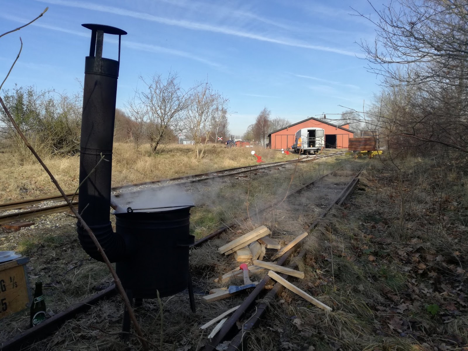 Arbejdet kom flyvende fra start og kl. 11 var alle spirg trukket op og de første nye sveller på vej i sporet. Spormål og underlagsplader var på plads på næsten hele strækningen da klokken slog 12, og frokosten var klar. I anledning af det gode vejr, var der chili con carne fra brændekomfuret.