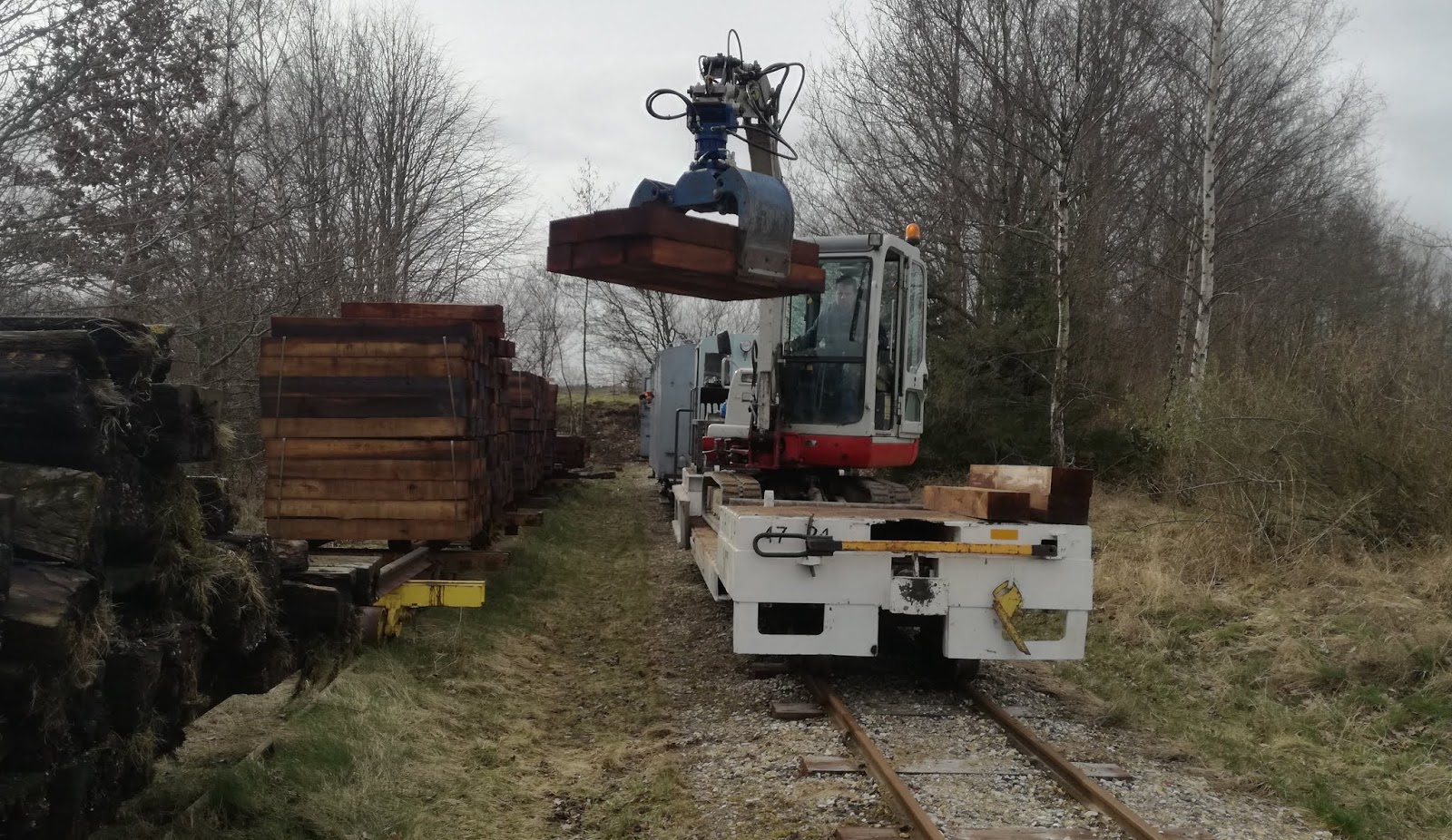 | Nye sveller hentes fra det rullende svellelager i udtrækssporet. |