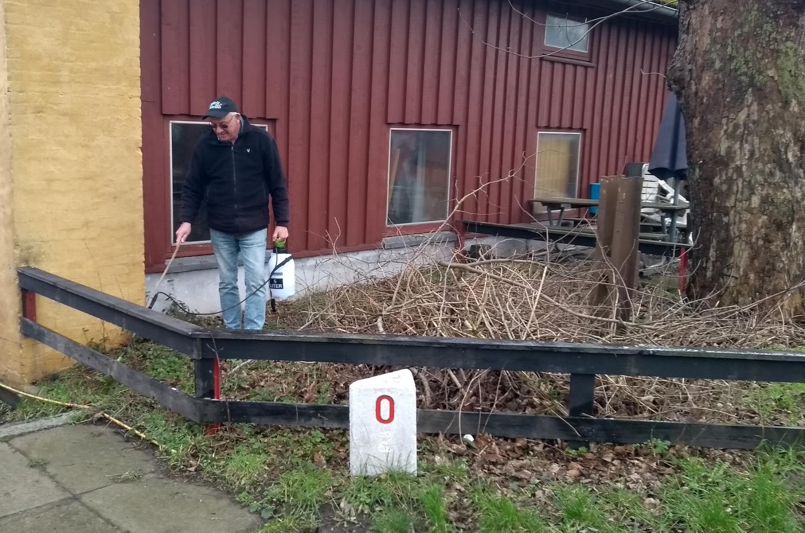 | Bruno fjerner alevækst fra hegnet omkring km. 0. |