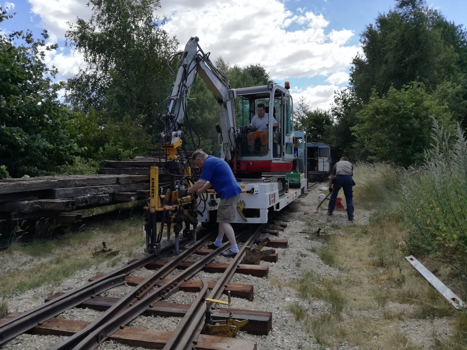To sporskifter blev understoppet med gravemaskinen påmonteret vores lille hydrauliske stoppeenhed. Efter justering af sporskiftet til rette højde med donkrafte, er det blot at guide maskinføreren (Lars), der har lidt begrænset udsyn til arbejdet. Jørgen klarede denne opgave på fornemste vis uden nævneværdige mængder af sved på panden, mens jeg flyttede donkrafte, tog og lavede lidt småforbedringer på sporskifterne.