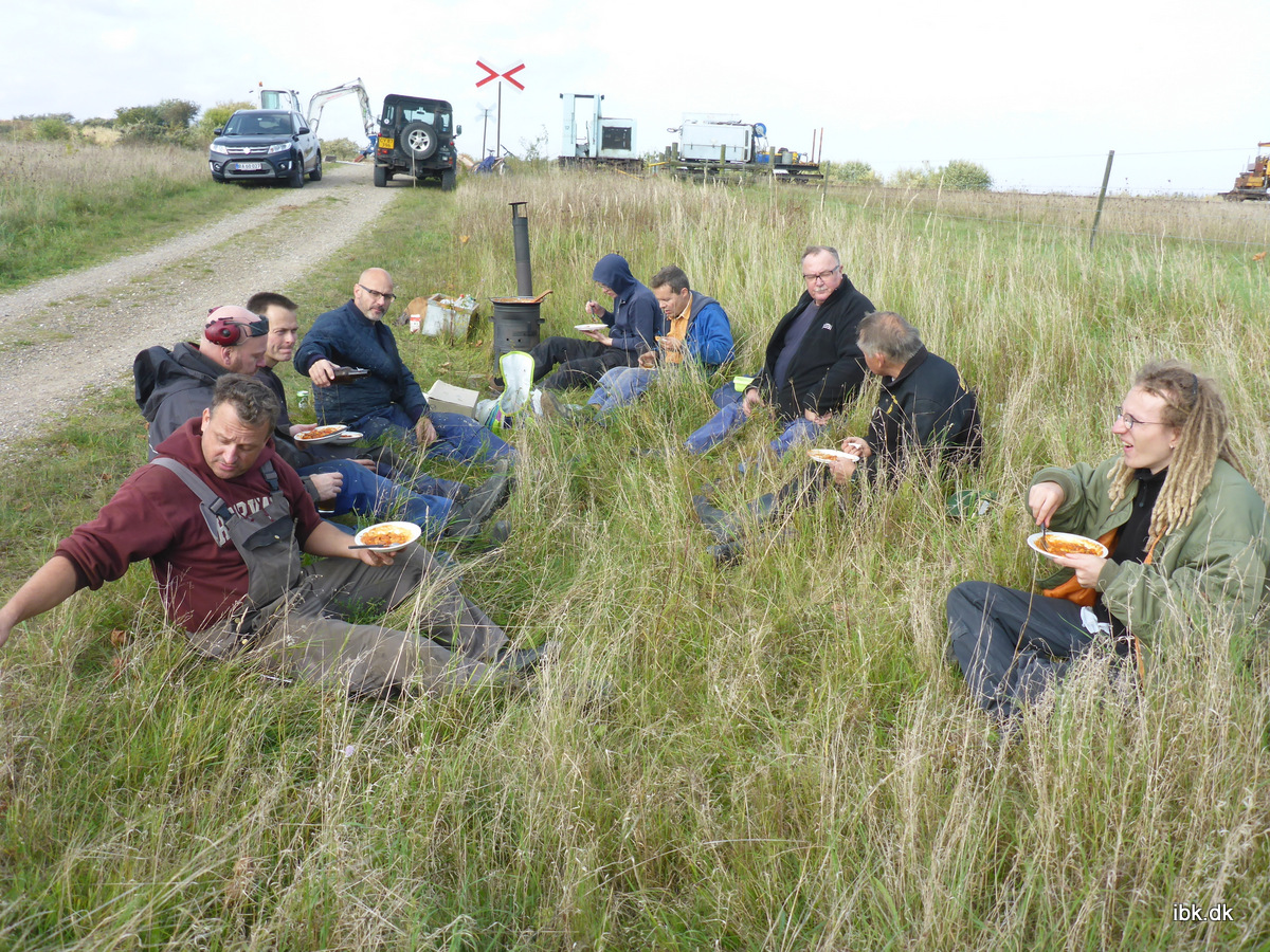 Vi kom derfor hurtigt i gang med at få spigrene op og skinnerne løftet til side, idet vi ikke kunne bruge metoden med at trække svellerne ud under skinnerne. Med vanlig flid fik vi hurtigt udskiftet og spigret svellerne og så blev der serveret Chorizo-gryde fra Claus´s feltkøkken, serveret med lidt smagsprøver af Sørens bryg. Efter en veloverstået bespisning i en solskinnet grøft, så var der kræfter til at fortsætte arbejdet med understopning og spirging af de sidste sveller. Efter en kaffepause med hjemmebagte kager, så fik vi afsluttet arbejdet med placering af tvangsskinner og genopfyldning med grus. Så lidt i fire var vi retur på Hedehusgården efter en herlig dag i den friske efterårsluft.