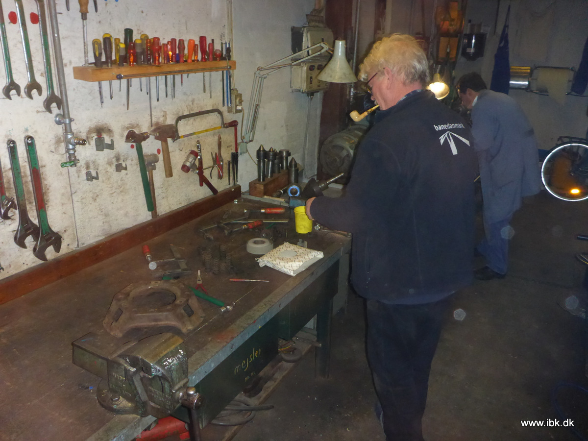 Niels og jeg viste Peter, en ny aktiv, rundt i alle de hellige haller og endte ved de to hjulsæt fra T1, som denne aften blev afrenset og derefter malet med Olsen-sort. Det lugter lidt, så også det får folk til at blive væk J 8 mand i fuld gang på værkstederne denne aften.