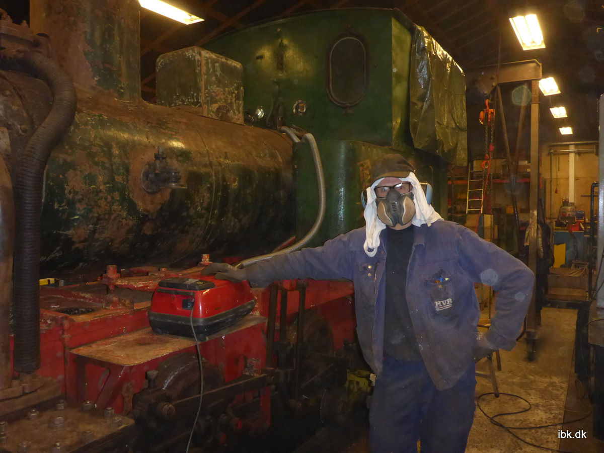 Det var simpelthen for koldt og mørkt til at køre Superfos-lokomotivet udenfor, men da der stadig er meget rust og maling at afrense, så blev der forsøgt med en dobbelt støvsugerløsning og presenning rundt førerhuset. Så kunne en del af støvet da holdes lokalt. Så kom stålbørsten ellers på arbejde derinde. Jeg fik derfor ikke fulgt så godt med i de øvrige opgaver denne aften. Dog fik Kjeld påbegyndt afrensning og adskillelsen af juletræet, så det kan blive grundig afrenset og flot malet. Lars O. fremstillede og svejsede en dims til gravemaskinen, som jeg dog ikke fik set det færdige resultat af. Erik og Martin blev færdige med pumpedræsinens trædæk, så sammen med Jan gik de på visit i vognhallen for at besigtige opgaven med renovering af melisvognen gm32. Det ville være herligt om det projekt igen kom i gang! Opgaven med at klargøre motorværkstedet blev fortsat og da Bo forleden kom videre med akslerne, så kan det snart være at værkstedet kan komme i brug til at samle E28 igen. Niels og jeg fik da også set på støvsugersituationen og snart bliver det nok rigtig godt. Der kom 11 medlemmer forbi i løbet af aftenen, så vi fik da også sludret og drukket en kop kaffe.