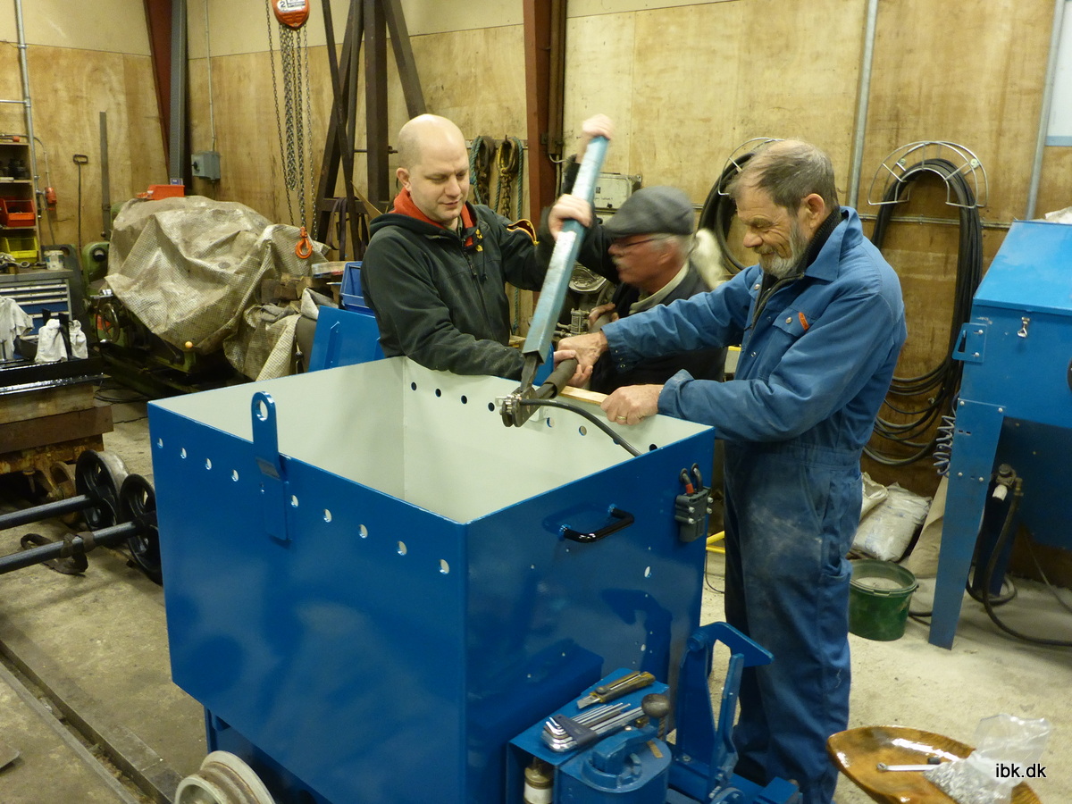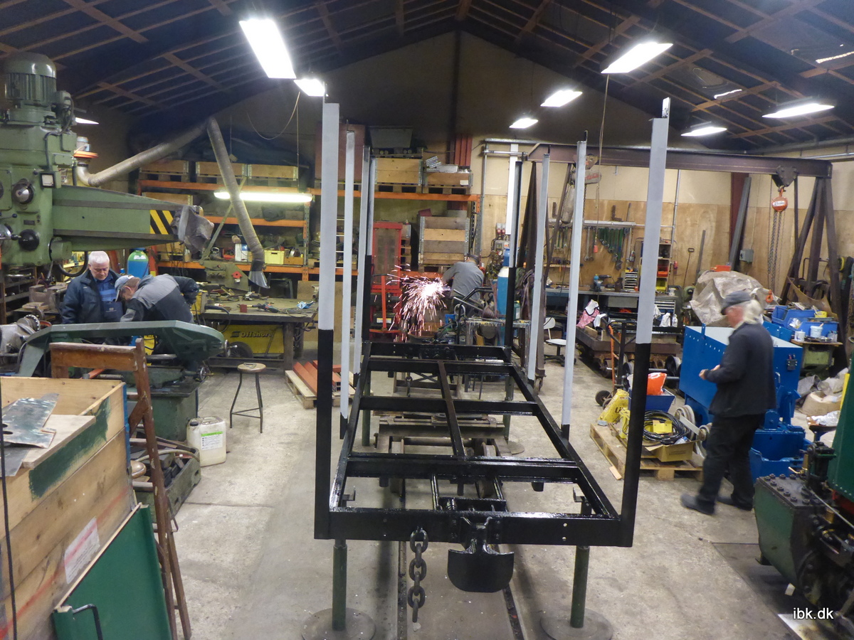 Jeg fortsatte hvor jeg slap i lørdags og malede videre på nederste del af rammen til C523, så den nu har fået 1. omgang, hvor den skal. Lars O. arbejdede på en forbedring af svelleoptagekløerne.