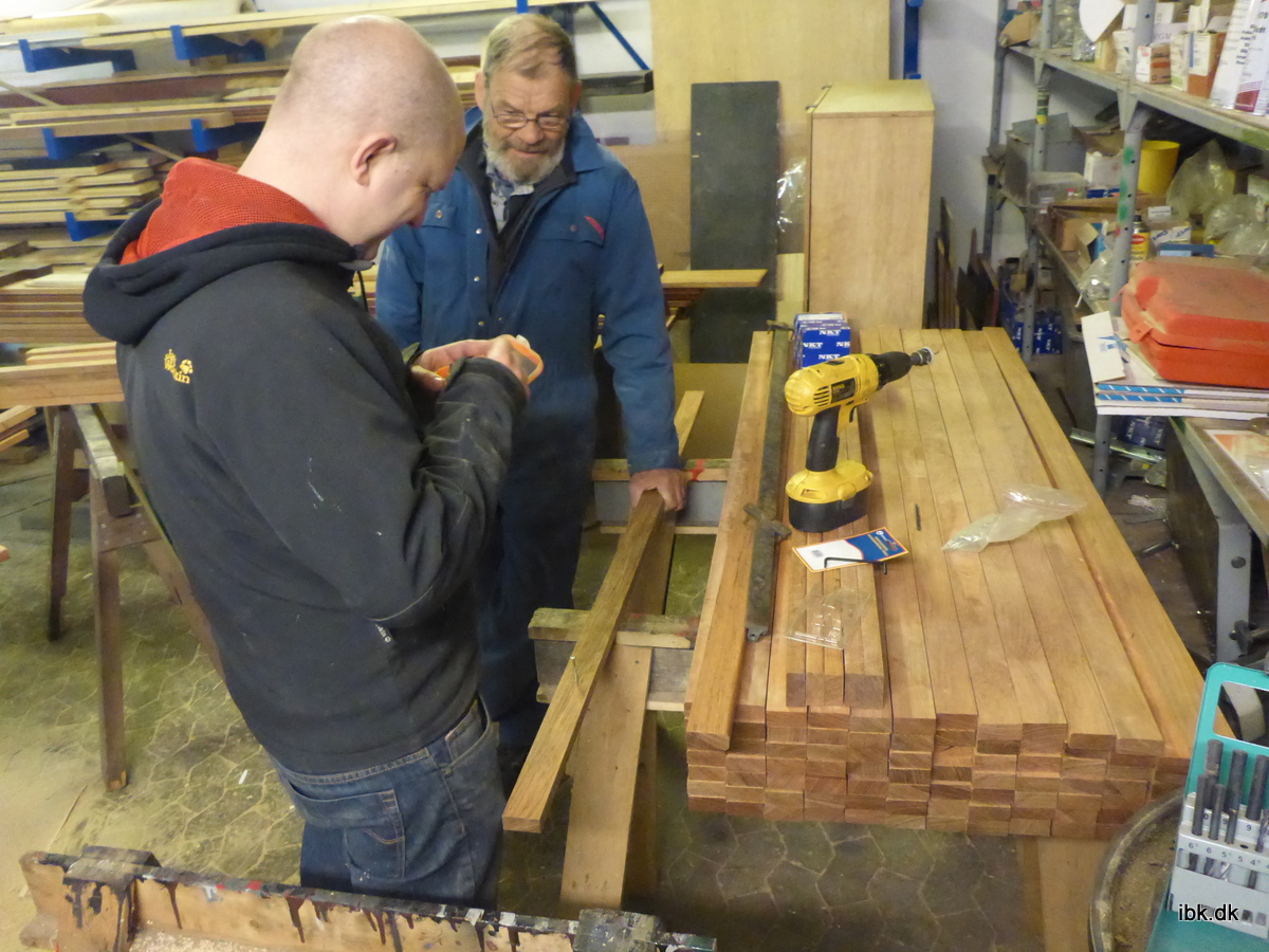 På snedkerværkstedet blev der udført de indledende forsøg med den selvcentrerende borelære, men nøjagtigheden er måske ikke tilstrækkelige for snedkerværkstedets feinschmekere og derfor arbejdes der på en mere præcis opstilling i søjleboremaskinen – med en kombineret bor- og undersænker isat. Det er rigtig mange huller, der skal gnaves! 11 flittige bemandede maskinafdelingens værksteder denne hyggelige aften.