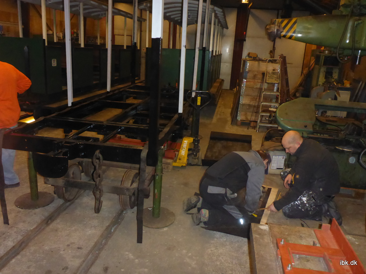 Klargøringen af personvogne er kommet godt fra start og blev fortsat denne kolde og stjerneklare aften. I onsdags blev en grundig test af E28 sat i gang og vi fortsatte denne aften med at anvende E28 til rangering af C1 og C2. Der skulle byttes rundt, så C2 kunne komme over graven. C1 er klarmeldt, men da Bafd forleden ikke kunne mønstre et fuldt lørdagshold, så er sporet fortsat ikke tilgængeligt til det næste hold vogne. Det betød til gengæld at Benjamin bidrog med at få fremstillet en holder til de specielle bræddebolte og grundmalet dem alle i lørdags, sammen med vinkeljern på endegavlene. Jeg fik så givet det hele en omgang sort. Vi brugte også lejligheden til at få afhentet de i udstillingshallen opmagasinerede gulvplanker til C523. De er nu lagt ud i den rette rækkefølge. Der blev også skåret tjærefilt til at lægge oven på vognrammen. Vi manglede blot tjæreklæber, så det må blive næste gang. I maskinværkstedet gik Per og Lars i gang med at dreje en ring, der skal bruges ved koblingspladen af M24´s brændstofpumpe til motoren. Den gamle ring blev tidligere forsøgt svejset, men det holdt desværre ikke. På snedkerværkstedet blev der arbejdet videre med håndlister og bænkebeslag. Vi fik også besøg af både Jørgen M, Poul T og formanden, så der var et hyggeligt rend af folk denne aften. Det giver 12 mand på Gården denne fine aften.