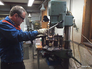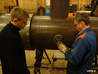 De nye flanger er nu svejset på kedlen af en certifikatsvejser og arbejdet med modparterne kan fortsætte. Peter og Bo fik tilpasset gevindboltene til samling af de to hovedstophaner på kedlen.