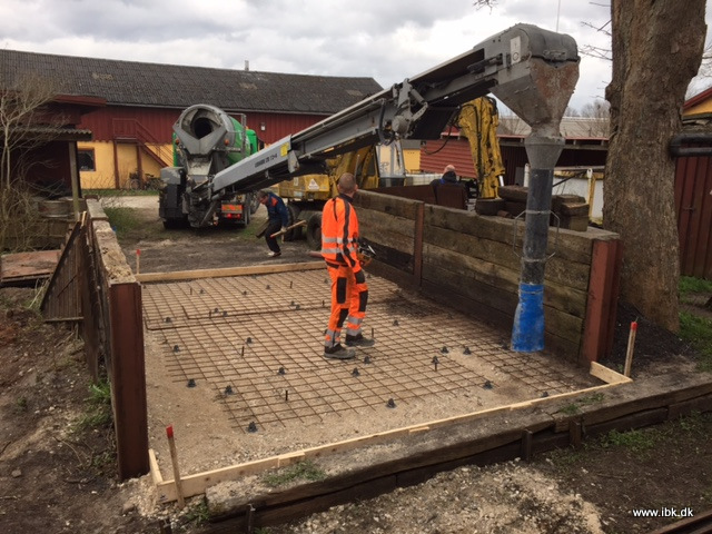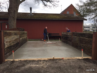 Dagholdet denne mandag havde fået støbt den nye bund i kulgården. Kenneth A, Lars og Bo fik sammen med en dygtig betonmand fyldt nettet op med god plutte. Sidst på aftene dækkede vi det over for at holde på fugten. Det var næsten ikke nødvendigt, da en fin støvregn faldt over det endnu fugtige beton.