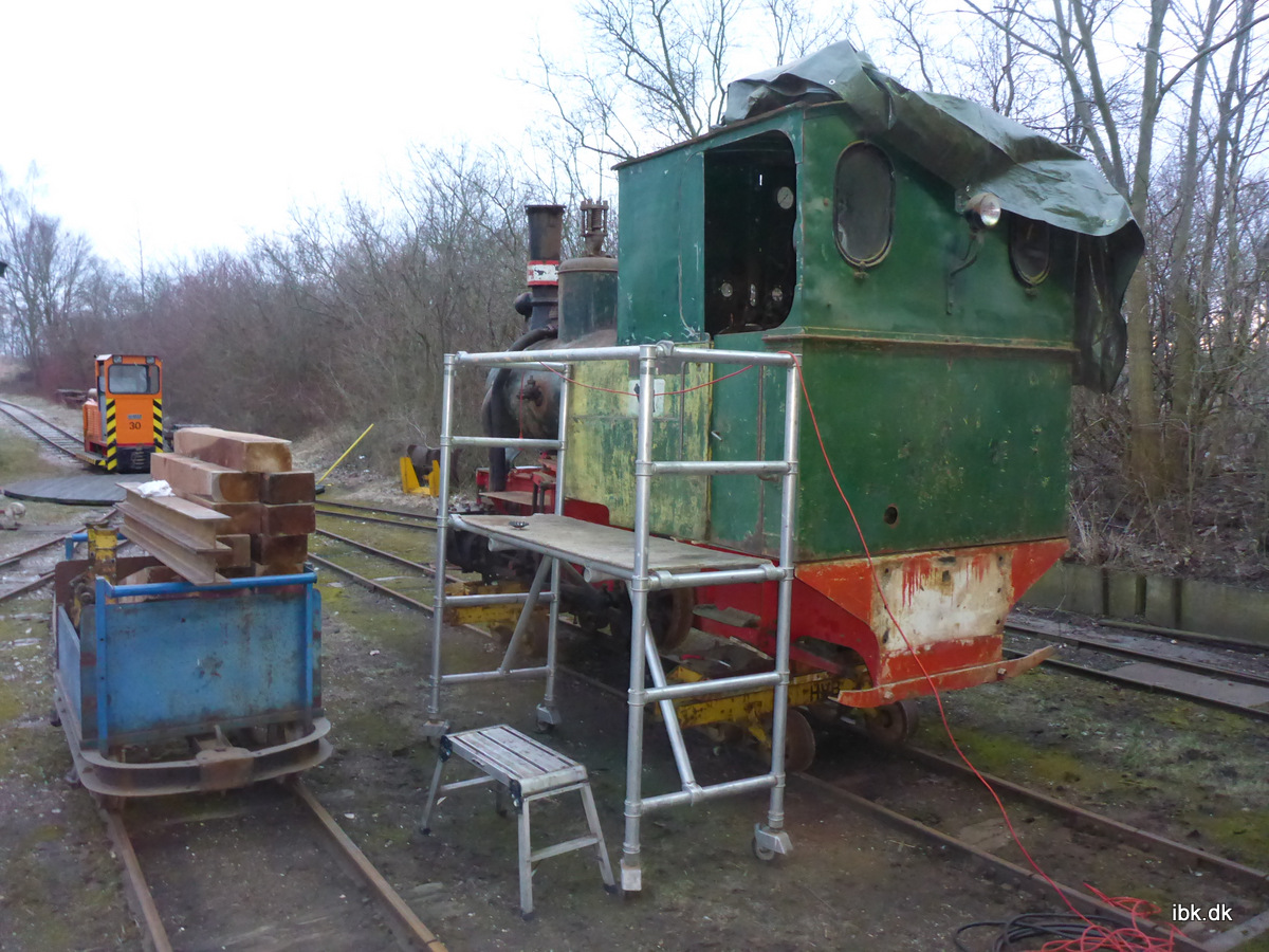 Superfos-maskinen blev trukket ud tidligt på aftenen for at udnytte det sidste dagslys. Dagens regnvejr var ophørt, så endelig blev der en lejlighed til at få kørt med stålbørsten på de udvendige flader. Det blev jeg så ved med, selv efter mørket lagde sig – men til sidst var det helt sort… Kjeld skiftede glas på sandblæseren. Det har været defekt i nogen tid, så det var dejligt. Niels afprøvede den efterfølgende, incl. det nye sand til afrensning af de dele han har fremstillet til en justerbar sikkerhedsskærm, som skal monteres ved den lille fræser. I snedkerværkstedet gik Martin, Erik og Carsten i gang med opskæring af lister til brug for fremstilling af limede tagbuer til overdækning af flere vogne. I alt talte jeg 11 på Gården denne aften, men kunne ikke holde øje med det hele 😉