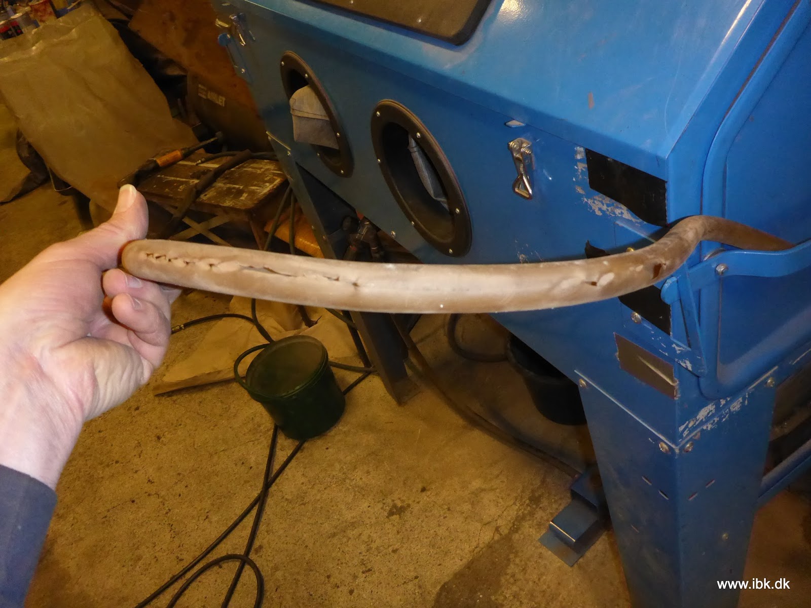 Carsten lagde sidste hånd på førerplads-forvæggen til T1, som jeg derefter fik afrenset, grundet og malet. Inden da måtte vi dog udskifte slangen til sandblæseren – efter 10 år kunne plastslangen ikke mere. Billigt skrammel 😉 Bagefter blev det godt og flere smådele røg derefter gennem sandblæser og grunder.