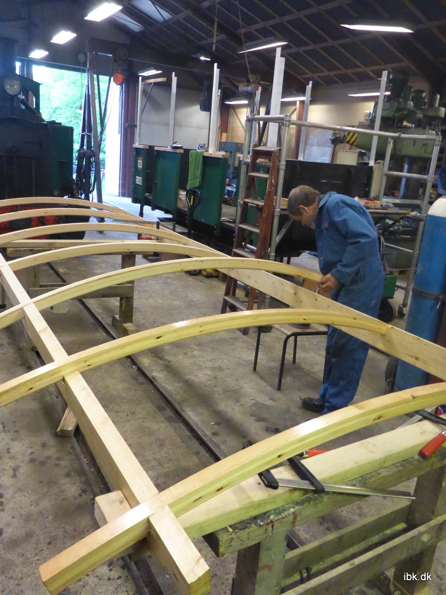 Forleden blev tagkonstruktionen til C523 båret over i lokomotivværkstedet og samlet og denne aften gav Erik delene så en grundig omgang med Gori 22, mens Martin gik i gang med at afrette sædelisterne. Carsten fik påsvejst det lille stykke på lejekasserne, der skal styre fjederen og bagefter fik tagholdet opmålt hvor mange brædder taget skal bestå af; 18 stk. pr tag skal der bestilles.