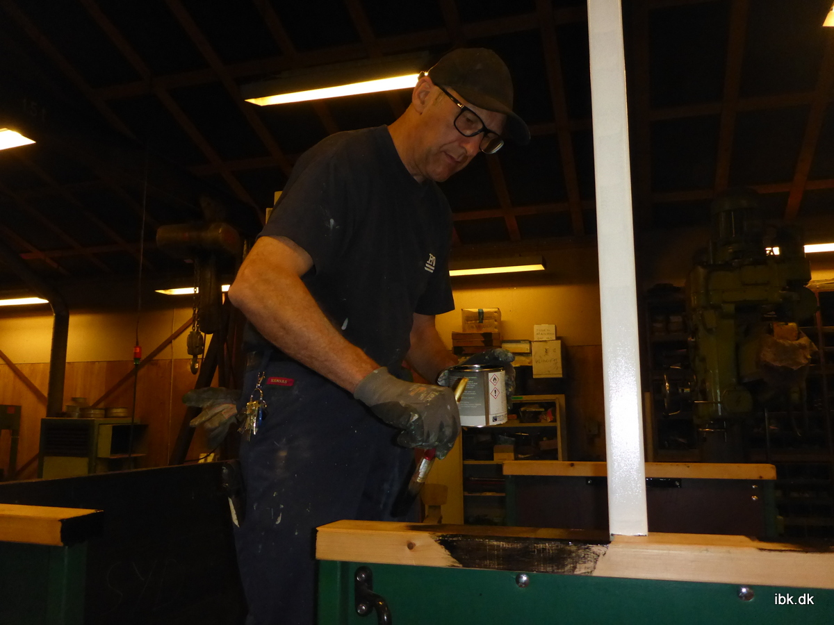 Kjeld tog sig af den beskidte opgave med at afrense hjulsæt for rust, mens jeg yndigt gik og malede tagstolper hvide og håndlister sorte. Inden havde jeg klippet en skabelon til en gennemsigtig ”røgkammer-dør” til Superfos-lokomotivet – så vi kan vise et kunstigt fyr til de besøgende – en dag… Nu vogn- og lokomotiveftersynet er vel afsluttet, så kunne Bjarne, Jan og Per igen vende sig mod D10´s motor, som tålmodigt har ventet. Den er nu flot blå og de fleste dele er igen monteret. En prøvestart nærmer sig. Der mangler blot lige det sidste… Onsdag holder de fridag!