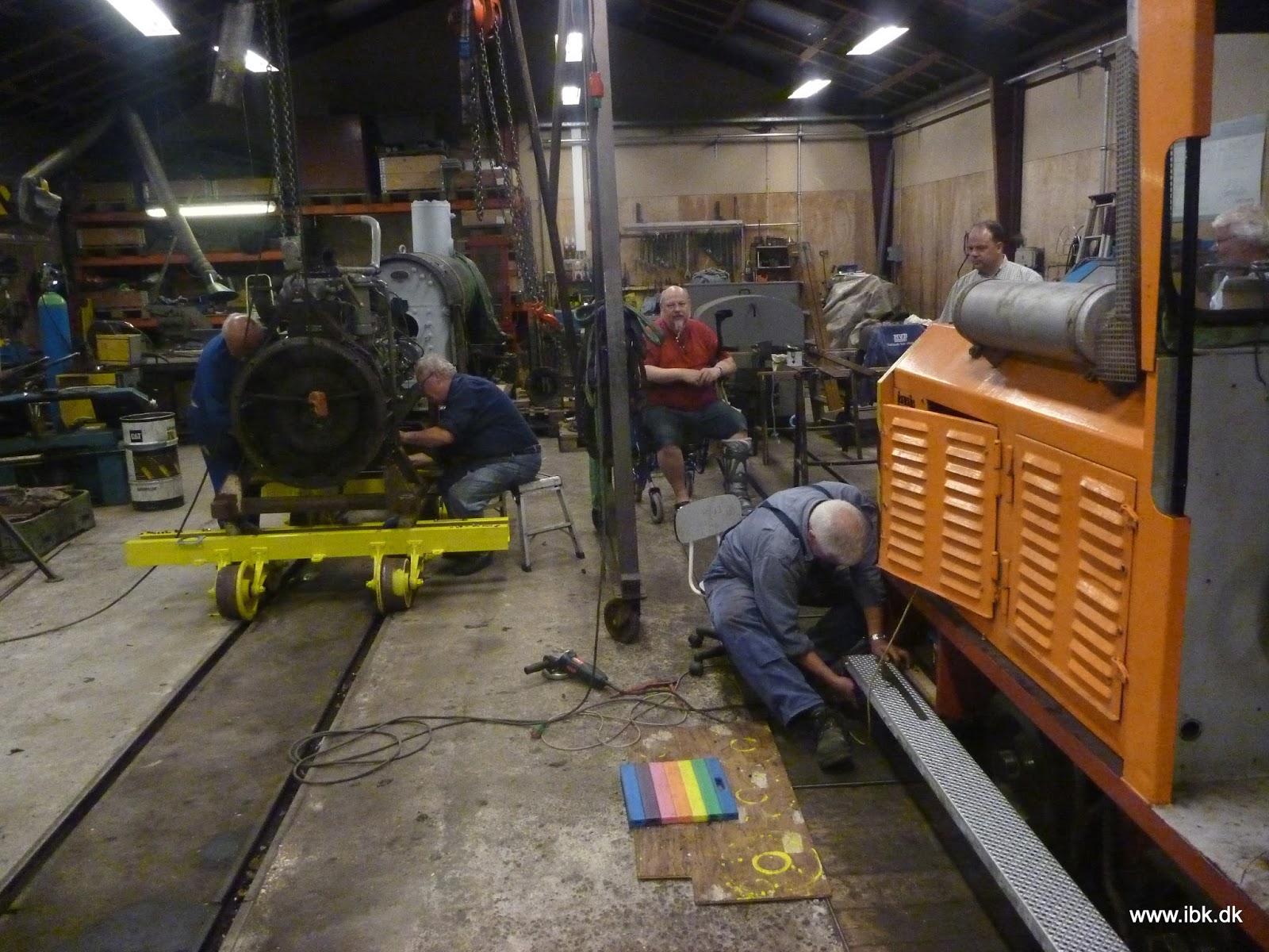 M25 motoren viste sig at dryppe fra sumpen, som derfor blev afmonteret. Først fik pakningerne skylden, men det viste sig også at gevindene i selve sumpen havde løsnet sig. Heldigvis har vi flere liggende i reserve og en ny vil blive sat på snarligt. Carsten arbejdede videre med montage af trinbræt på M30 og jeg fik malet de allerede grundede fodplader/ sparkestykker og afrenset en side mere. Dog ville sandblæseren ikke rigtig køre og en god del af aftenen blev brugt på at tømme hele systemet for sand. Nu må vi se om det er blevet bedre… Vi havde flere fine sommergæster på besøg og samlet var vi 8 mand på værkstederne denne regnvejrsaften.