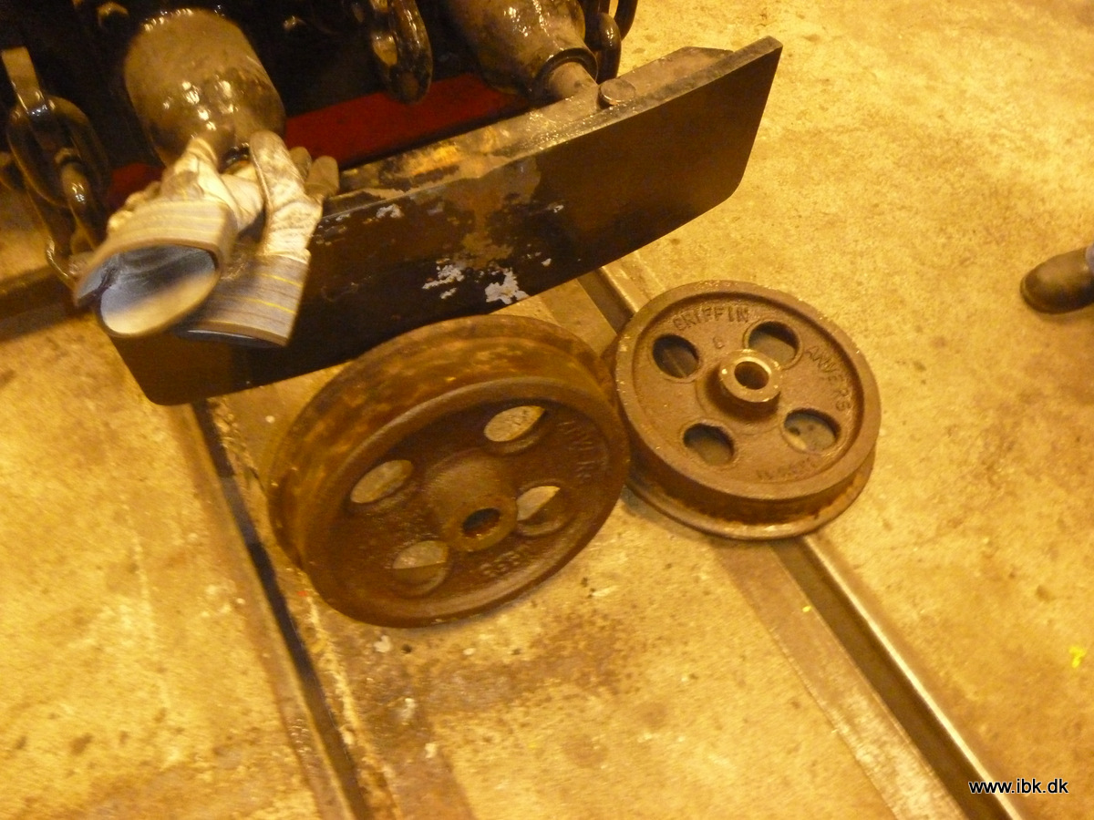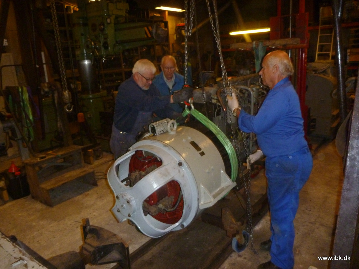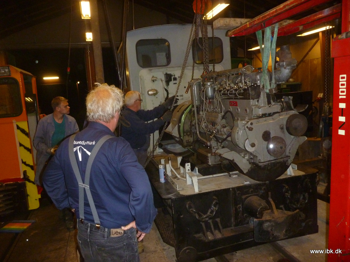 Så kom motor og dynamo tilbage på rette plads i M25! Denne aftens store opgave var at løfte den samlede, meget tunge enhed ned på ophængene. Der er ikke ret meget plads at give af, men med brug af talje og stabelløfter i flere små ryk, så lykkedes det forholdsvis problemfrit. En lige så stor opgave fulgte med at få monteringsboltene til at fange gevindene. Det krævede en masse små ryk i flere retninger for at ramme hullerne præcist nok. Vi var næsten alle mand på opgaven i perioder, men nåede også at måle advarselsstriberne op og sætte malertape på M30, men at male nåede vi ikke. Peter fik til gengæld akselstumpen ud af det andet tipvognshjul, så de er klar til en ny aksel. Poul og Lars fik frigjort en bolt fra et par defekte slingrestyr til M25, så de er klar til at blive monteret. Mens Jan gjorde M25 klar til at modtage motoren fik Per malet inddækningerne på M25 og Carsten fik svejset de nye sandkasser til M15; snart M3. Så vi var 8 mand, der arbejdede og som var enige om at gårsdagens hyggelige afslutning på sommersæsonen havde budt på godt flæsk og prima øl…