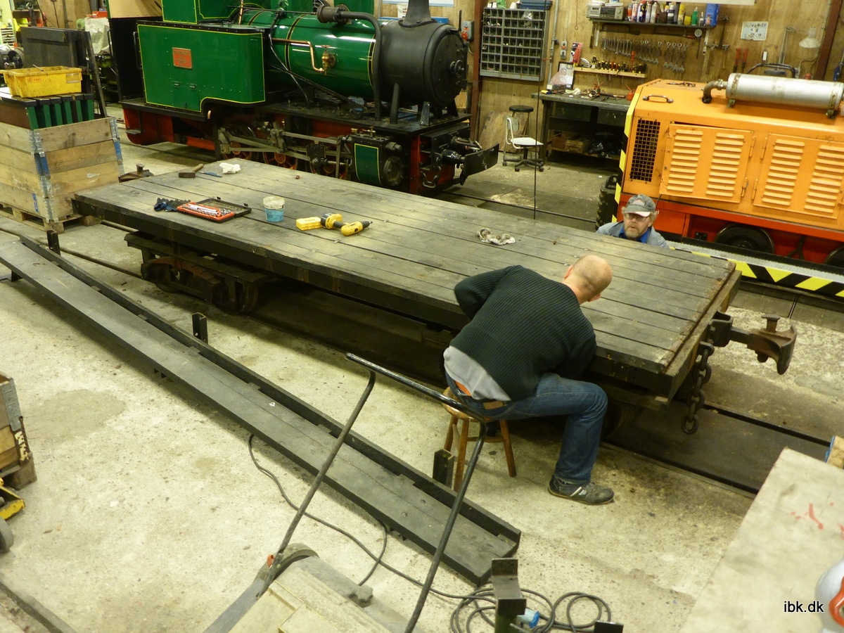 E28 er nu klar til at komme ud af maskinværkstedet og over på egne skinner. Til det er der aftalt hjælp fra en af de store maskiner, der for tiden spærrer adgangen til vores værksteder. Så lokomotivtransporten blev derfor forberedt denne aften. Niels gik i gang med en reparation af den rustne og knækkede fløjte fra Superfos-lokomotivet – som jeg slet ikke nåede at få malet på denne aften… Til gengæld fik Jan og jeg gennemgået vores beholdning af maling og skrevet en indkøbsliste og Kenneth fik læsset en stor stak brændeknuder af, så der er lidt flækkearbejde. Vi var 14 arbejdsomme og rundvisende folk på Gården denne aften.