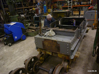 Carsten og Hans fik desuden arbejdet videre på T1, der nu er vendt om, så man kan komme til fra neden. Carsten renoverer bl.a beslag til fjederophæng, så de kan blive nittet på i stedet for svejset. Lars og Peter fik bl.a. skiftet stikket til fremmednet på gravemaskinen. Det foregik ude i vognhallen. Vi var 8 mand på værkstederne og havde det så skægt, så mange af os først sluttede arbejdet lidt i 23…