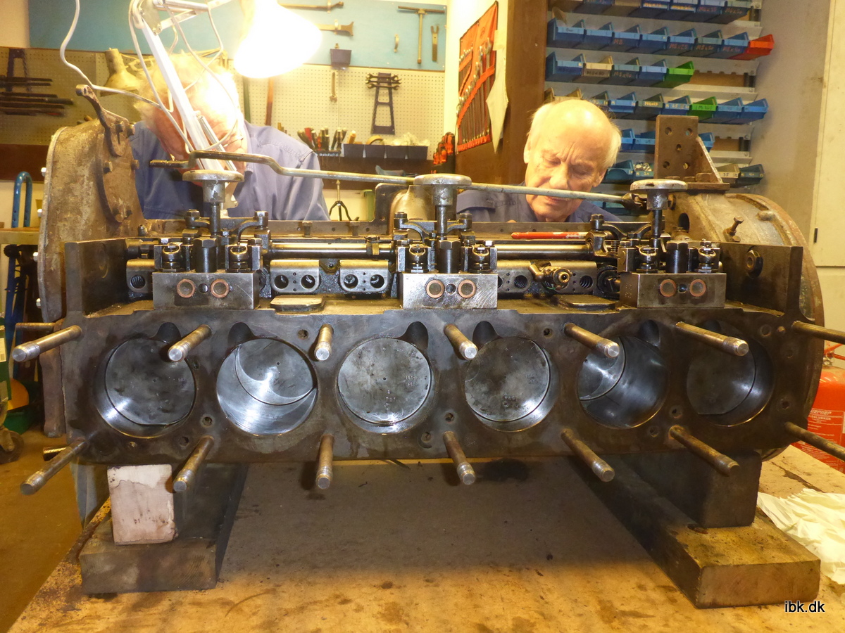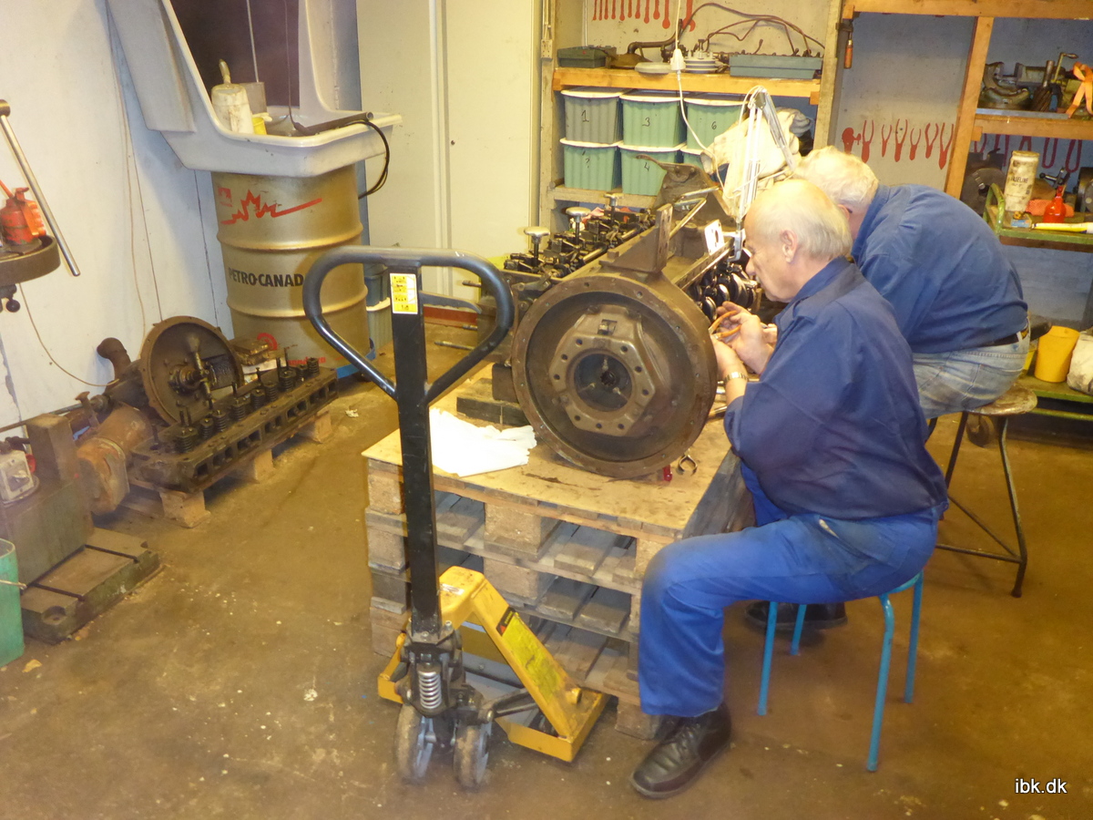 Inde i varmen sad Bjarne og Jan og sikrede de genmonterede plejlstangslejer med tråd. Det er noget af et pillearbejde! Per fik adskilt og gennemgået vandpumpen og derefter afrenset huset, så det kan få en frisk omgang maling. Niels arbejdede videre med opstillingen til samling af fløjten til Superfos-loket.