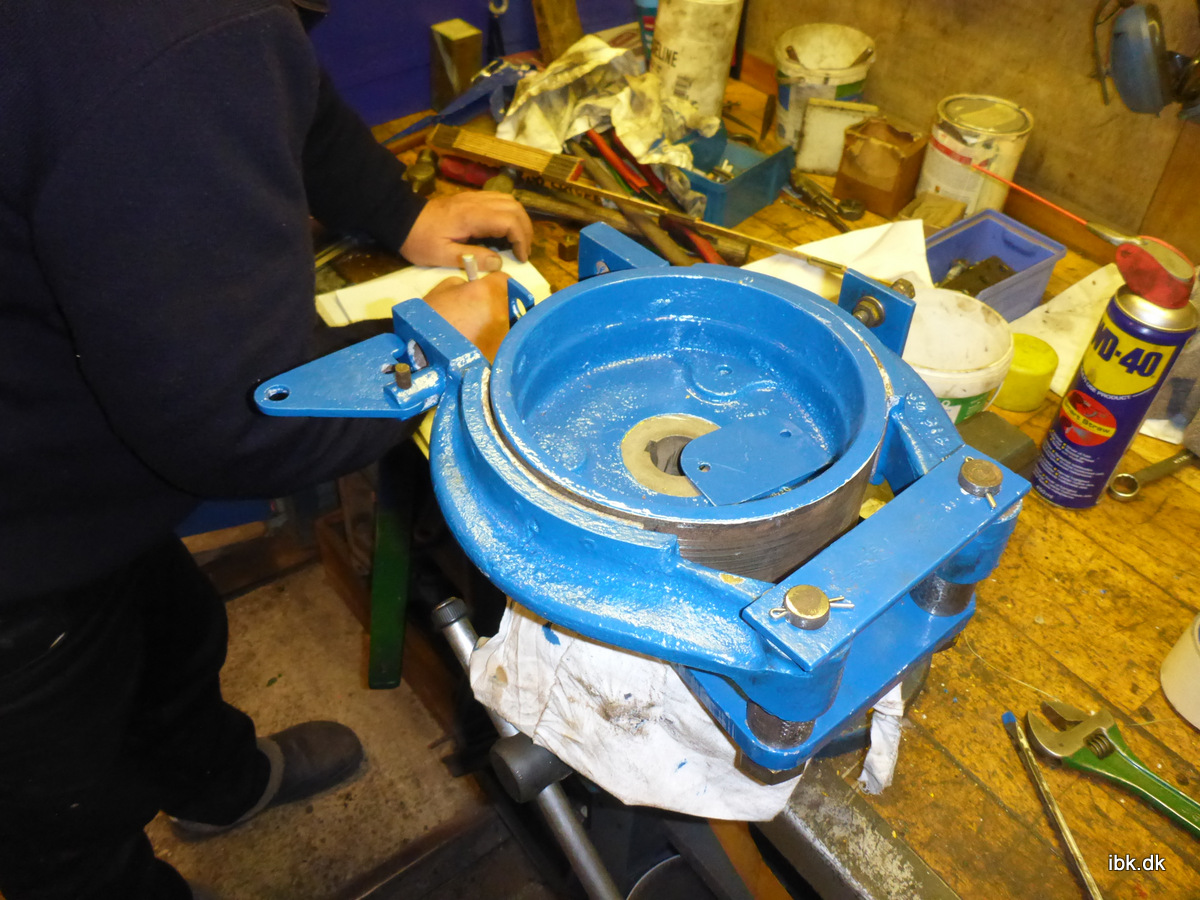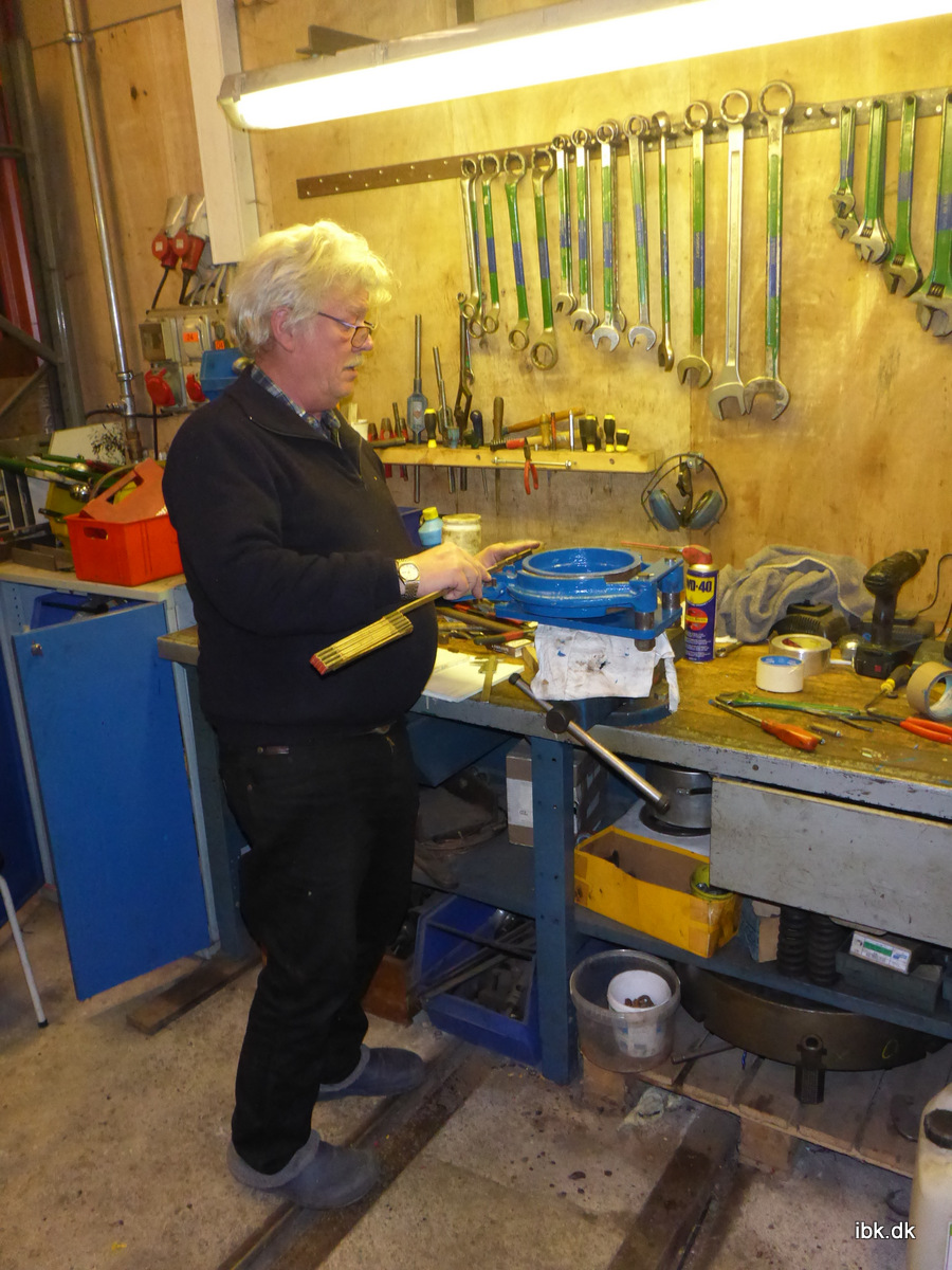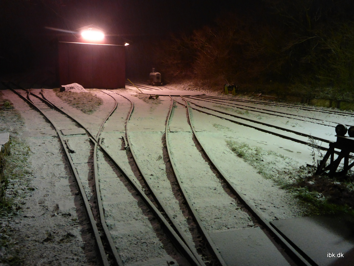 Heldigvis gik anden weekends juletrafik endnu bedre end den første. Vejret gik atter en gang vores vej, så vi slap for regn & slud. Omvendt måtte vi så konstatere at snevejret må have været lige om hjørnet for denne mandag aften faldt sneen med store fnug. Bjarne og jeg fik genrejst et julebanner, der var blæst ned i fredagens kraftige vind og bagefter fastgjort det andet, der hænger og pynter på museumshallen. Der havde blæsten også flået i linerne. Hans fik opmålt den forsvundne del til E28´s bremse, som Niels senere fik overdraget arbejdstegningen til. Det bliver en fin testopgave at løse! Men med den megen sne og værkstedet fyldt med driftslokomotiver, så var resten aftenen mere til at drikke kaffe og se film og derfor blev der hygget i Damp a´ – en slags forpremiere til på mandag, hvor vi traditionen tro afslutter året med julehygge og smalsporet underholdning. 8 mand mødtes på den snedækkede Gård.