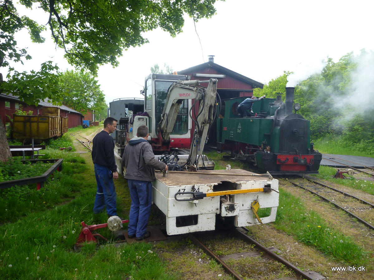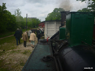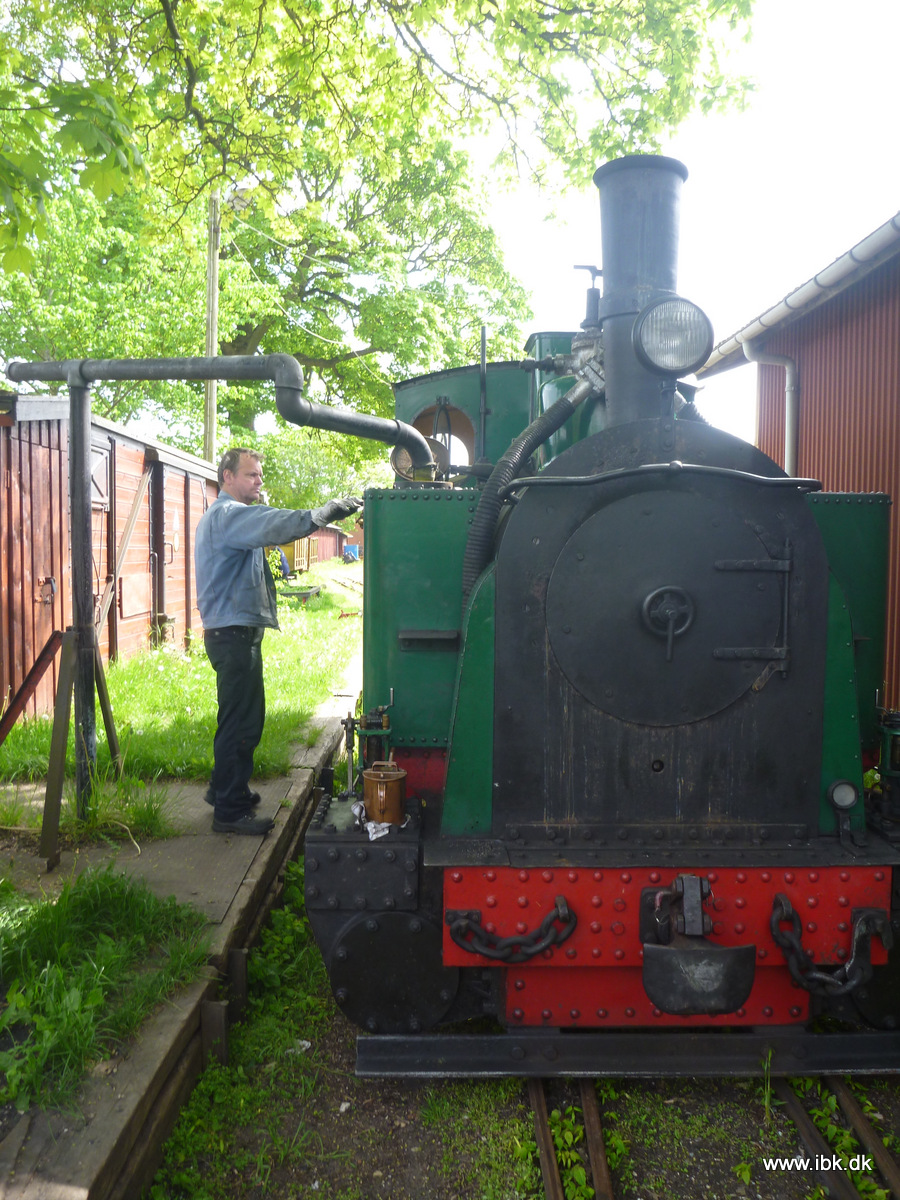 Så fik jeg endelig taget mig sammen og meldt mig som fyrbøder-aspirant efter 15 år i klubben og den første tjans blev et særtog på en solbeskinnet lørdag. Jeg mødte derfor min lokomotivfører og læremester Bo 9.30 og påbegyndte opfyring med træ. Jeg fik heldigvis ild hurtigt med en enkelt tændstik og fyret brændte som det skulle. Vi forstyrrede Carsten lidt i arbejdet med at sætte trinbrædder på M30 og fik ham til at trække lokomotivet ud med ”Grønlænderen” der kaldes sådan fordi den har kørt med kryolit i Iviqtut. Det er dog stadig under renovering, men det er kun detaljer, der mangler. Kl.11 begyndte trykket stille at stige, mens vi fik afvasket hele lokomotivet grundigt med vand og sæbe og smurt lejerne op. Bo benyttede også lejligheden til at smøre og massere overtryksventilen, så den kan åbne effektivt. Kl. 12 var trykket 8 bar. Her smed vi lidt kul på og snuppede en omgang frokost og kl. 13 stod manometeret på 10 bar. Så vi kørte hen og påfyldte vand og kul, så der var nok til turen. Så blev der rangeret en vognstamme frem og kørt til perron. Vores gæster ankom samlet i en stor bus og kom hurtigt ombord, da de var lidt forsinkede.