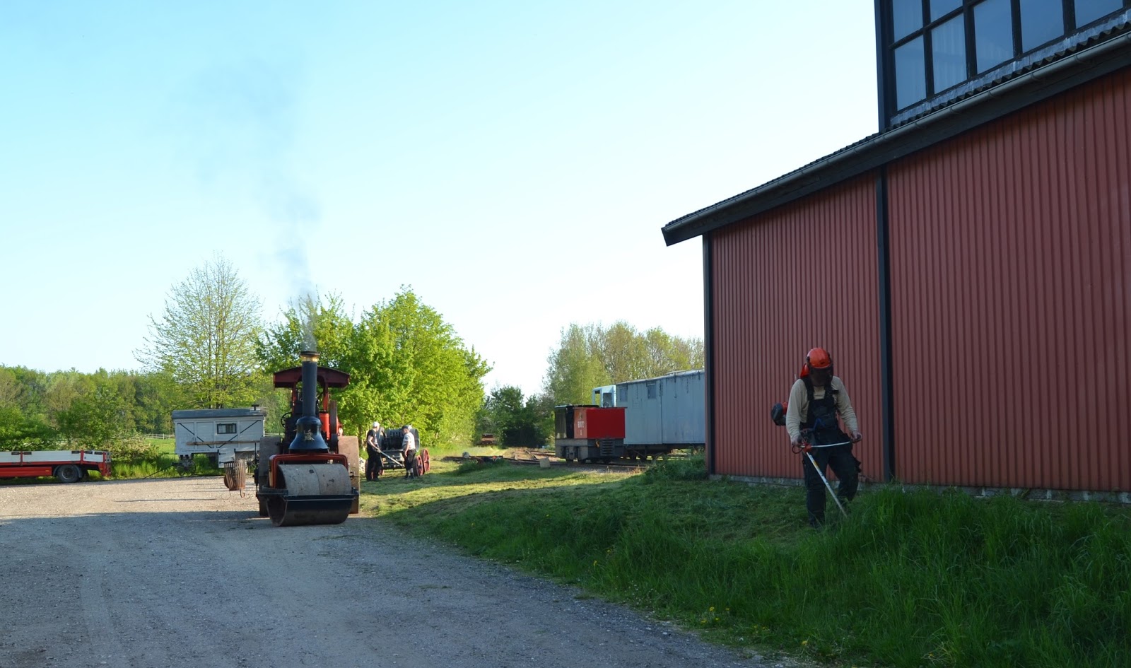 | Mens Damptromleklubben rigger til i baggrunden, slår Kenneth A græsset på skråningen. Solen står lavt og om lidt tændes der op i grillen. |