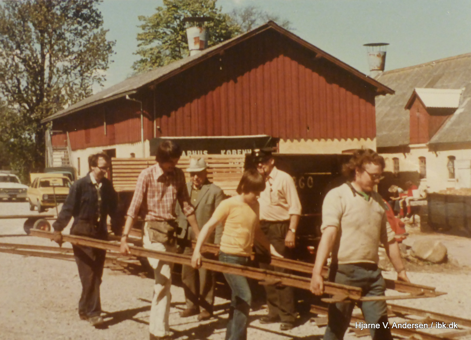 Endnu et af Hjarnes fotos, taget et par dage inden den store indvielsesdag. Roevogn 260 skal flyttes fra værkstedet og hen til den lille bane-stump og det sker ved at flytte sporrammer en efter en…