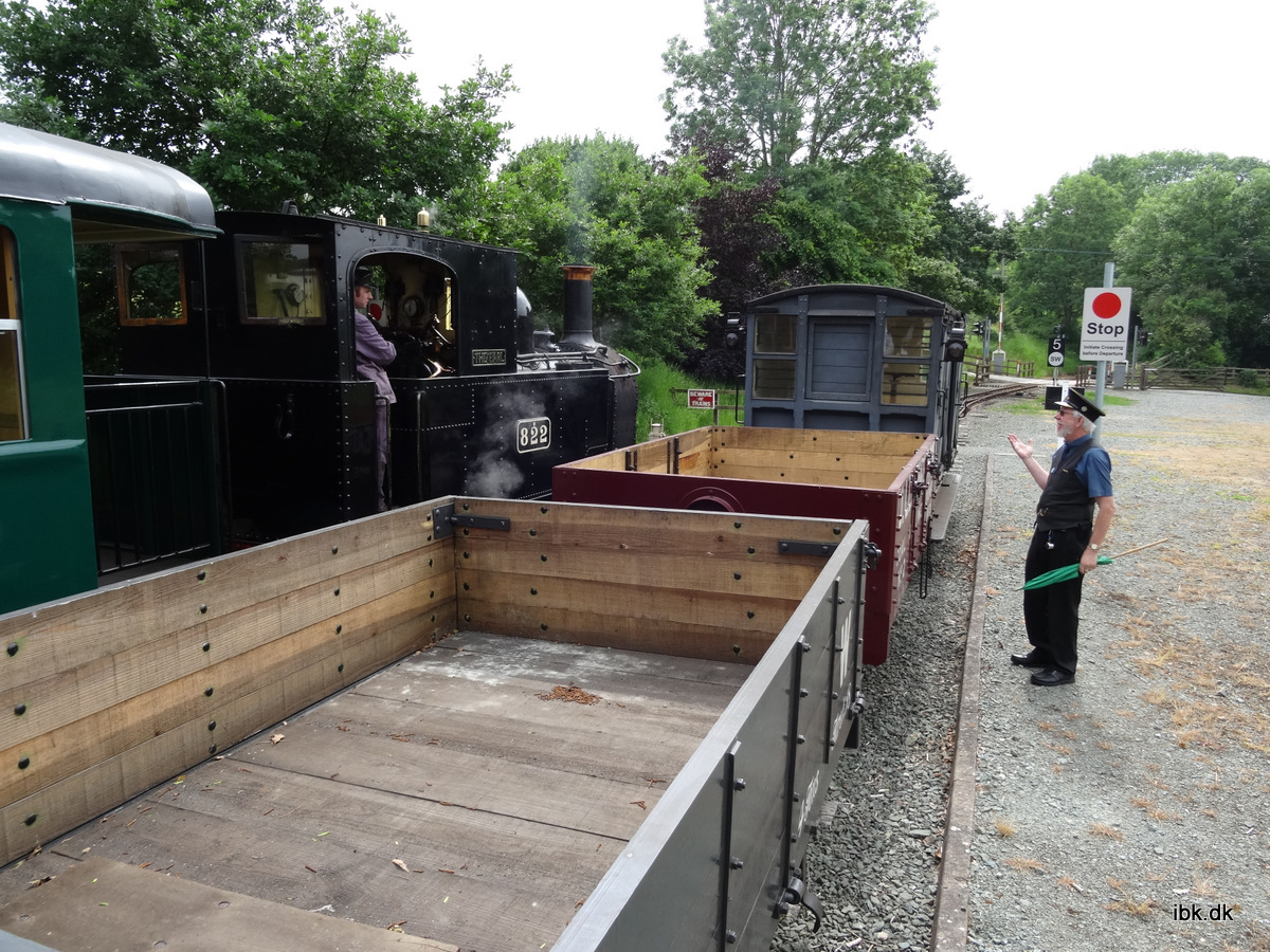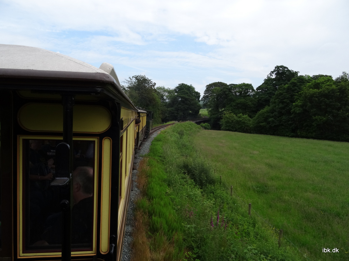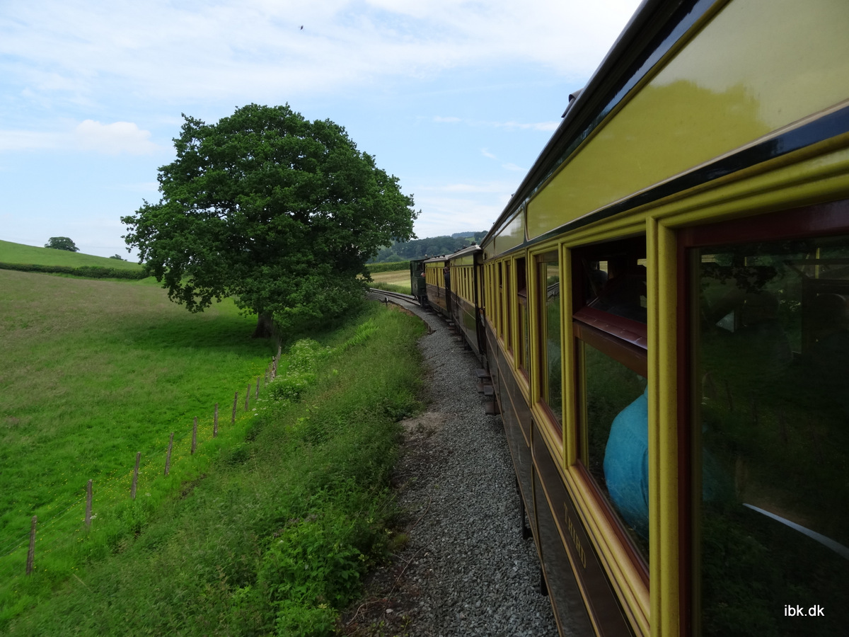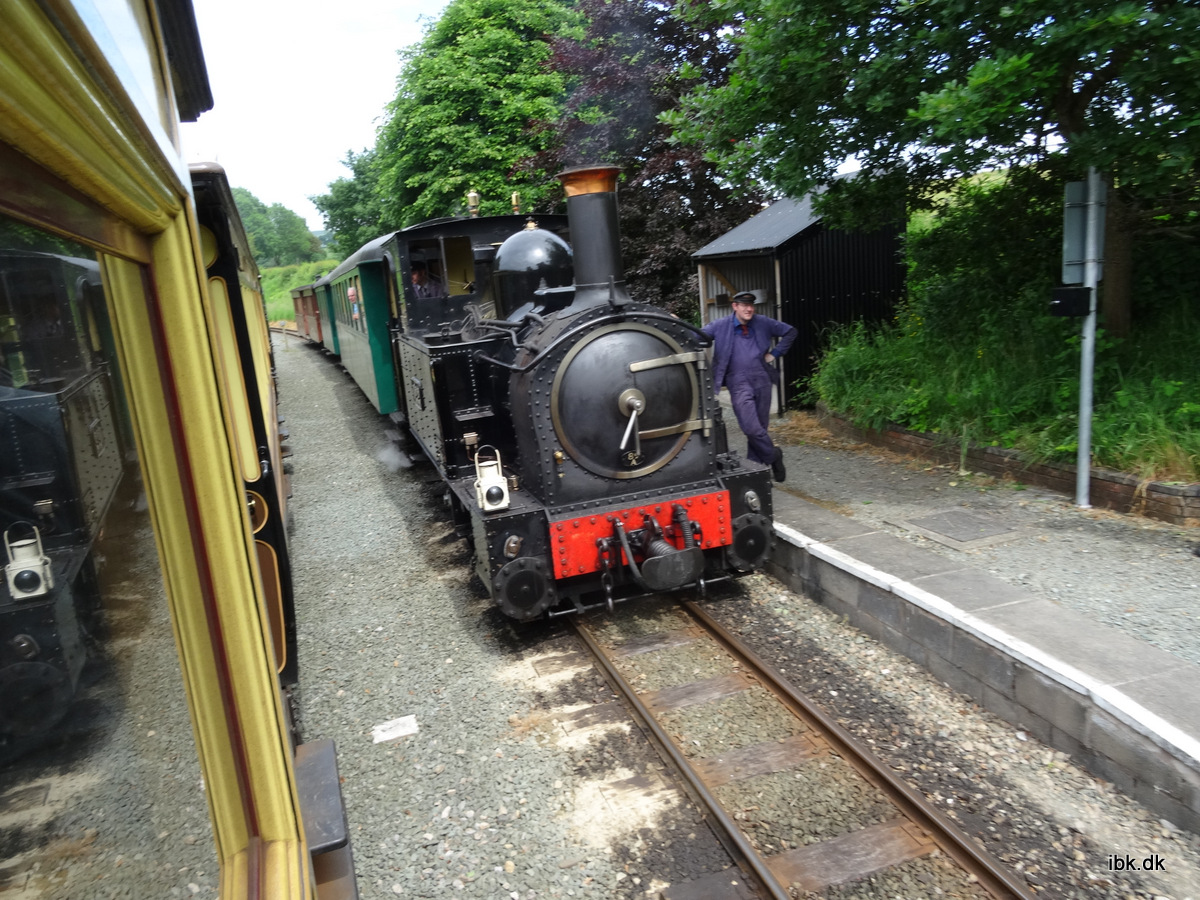 Stationen i Llanfair var hyggelig og autentisk og der blev serveret dejlig kaffe i den lille café. Veteranbanerne her har ofte en veludstyret butik med alskens souveniers og denne var ikke en undtagelse. Vi så lokomotivet rangere rundt og der blev desuden indsat lidt godsvogne. Turen ned til Welshpool foregik i en vogn reserveret til os og der var desuden fine endeperroner at stå på. På lange dele af stræningen fulgte vi en strømmende flod og naturen omkring var smuk og grøn som den er i Wales. Det var en meget fin bane. Vi passerede det opkørende tog undervejs ogdet ville nok have være sjovere at køre med opad, men det passede ikke med vores stramme tidsplan. Da vi ankom til Welshpool stod bussen klar, for vi skulle straks videre til Bala Lake og forsøge at nå at se dagens sidste tog ankomme… (se videre næste torsdag!)