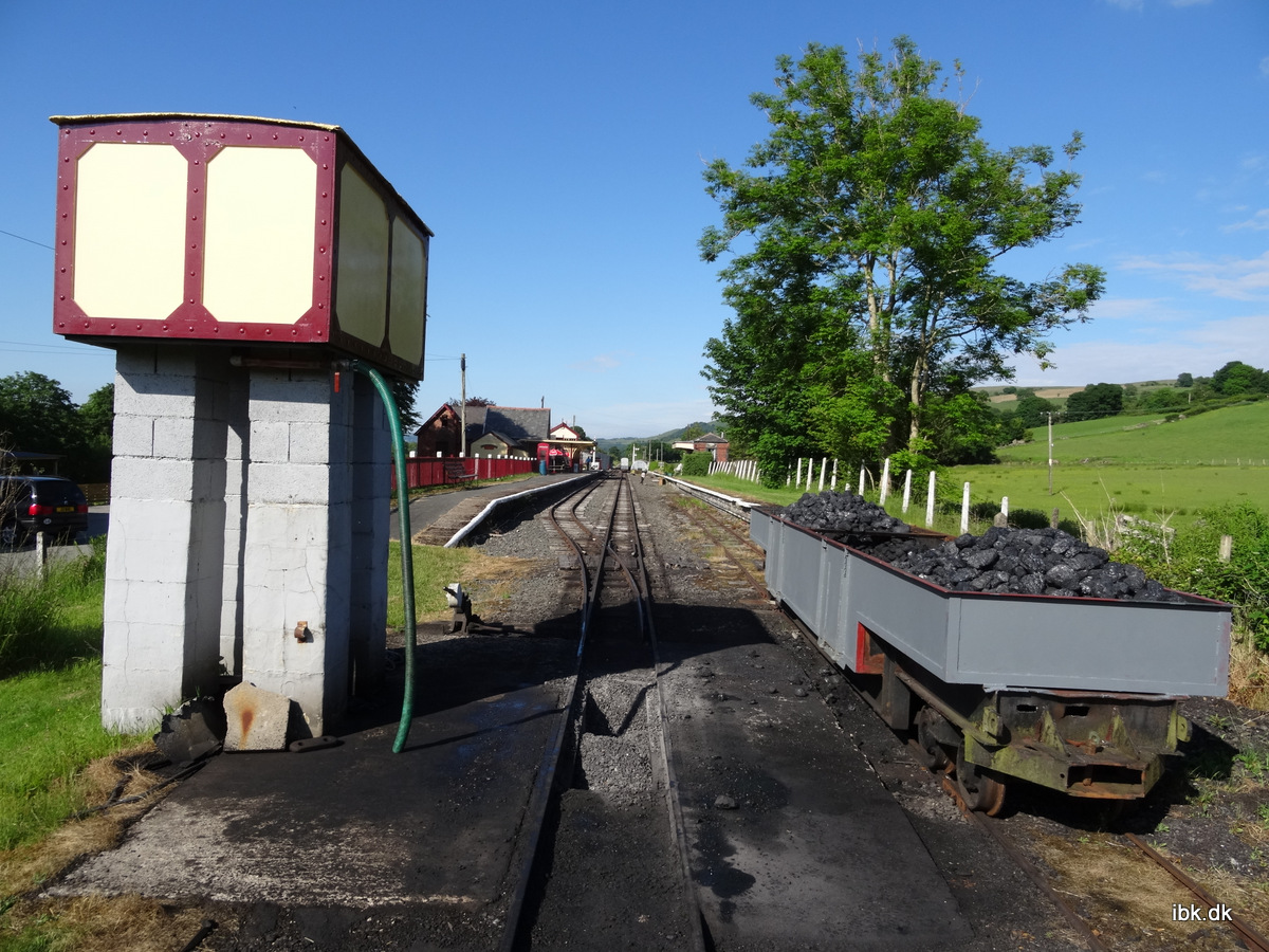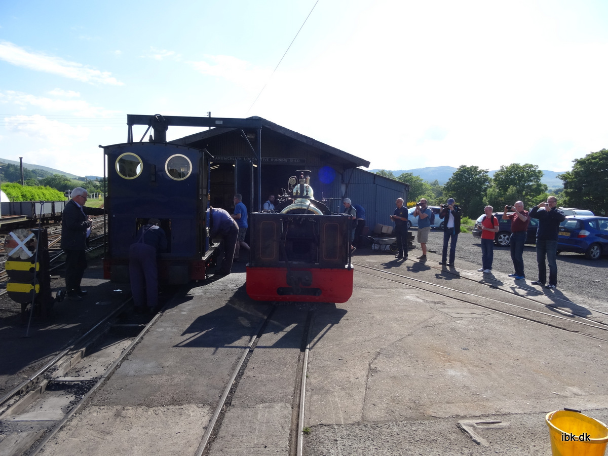 Bussen kørte som død og kritte fra Welshpool for at vi skulle nå at se toget ankomme. Men trafikken ville ikke lade os nå frem i tide, så da vi endelig ankom til Llanuwchllynog havde fundet et sted at parkere på de smalle veje og kom hen til stationen, var vognene kørt i hallen – men lokomotiverne stod der stadig og vi fik derfor både en hyggelig snak med det flinke personale og taget en masse billeder. I vognhallen stod de lukkede vogene – der virkede velegnede til at køre med i regnvejr 😉 Vi fik lov at snuse rundt på hele området, så det blev et fint stop alligevel. Så må man jo bare komme igen en anden gang!