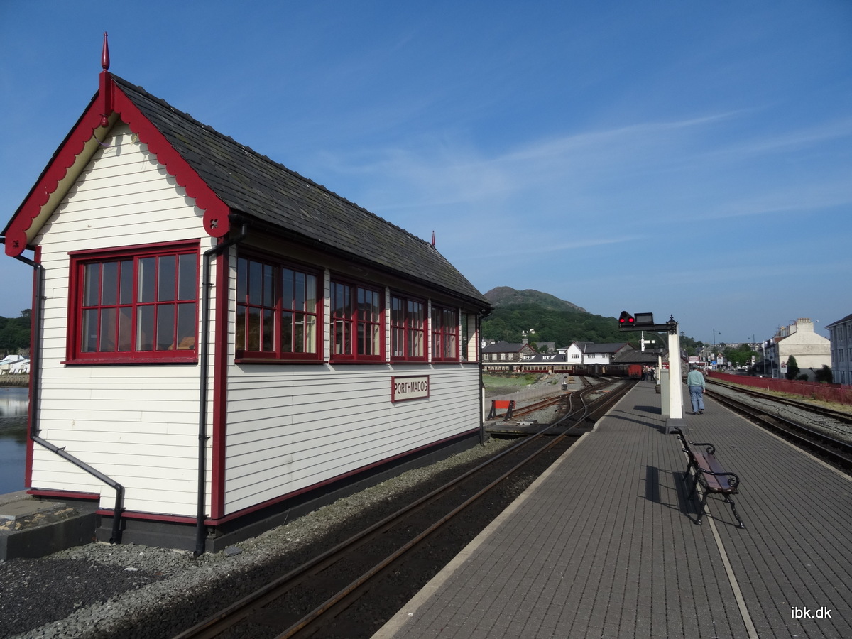 | Porthmadog signalhytte og med station og vogne i baggrunden |