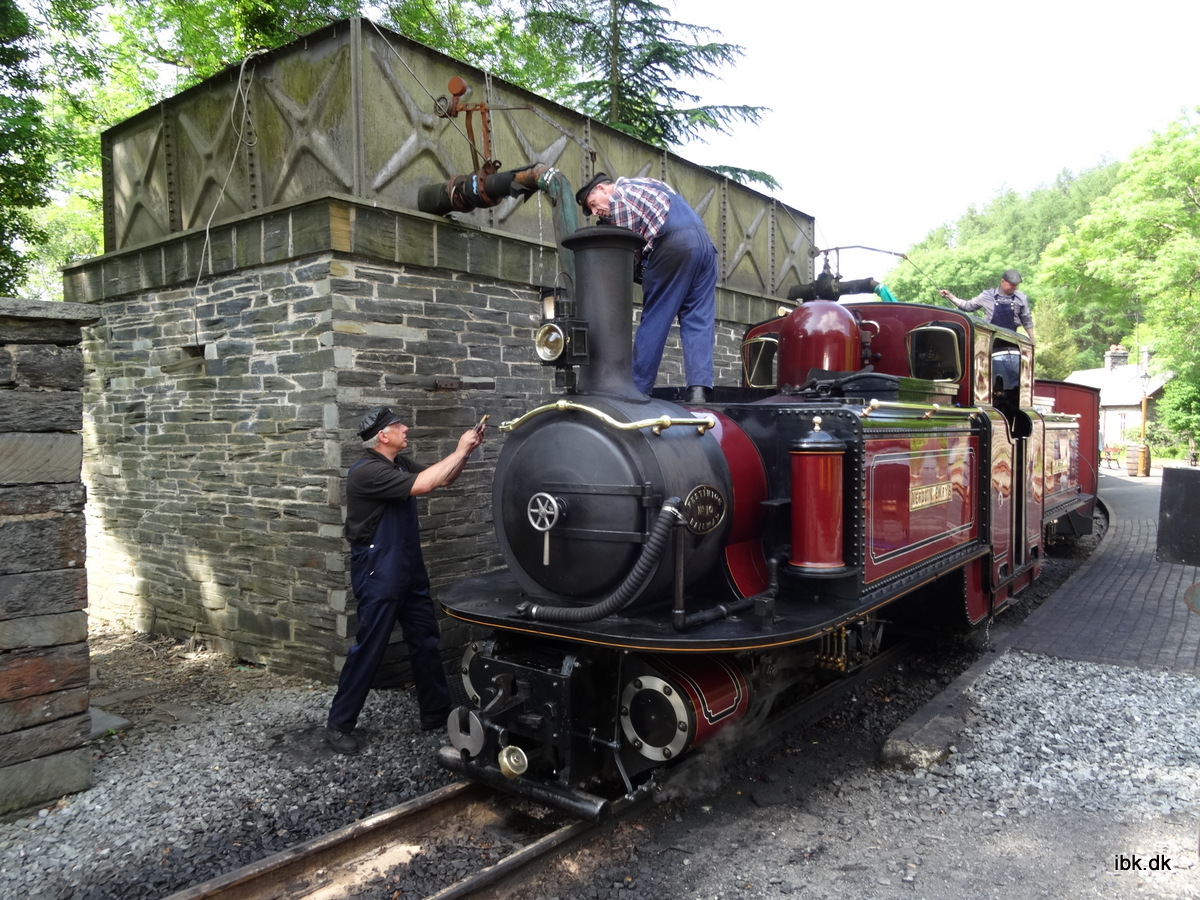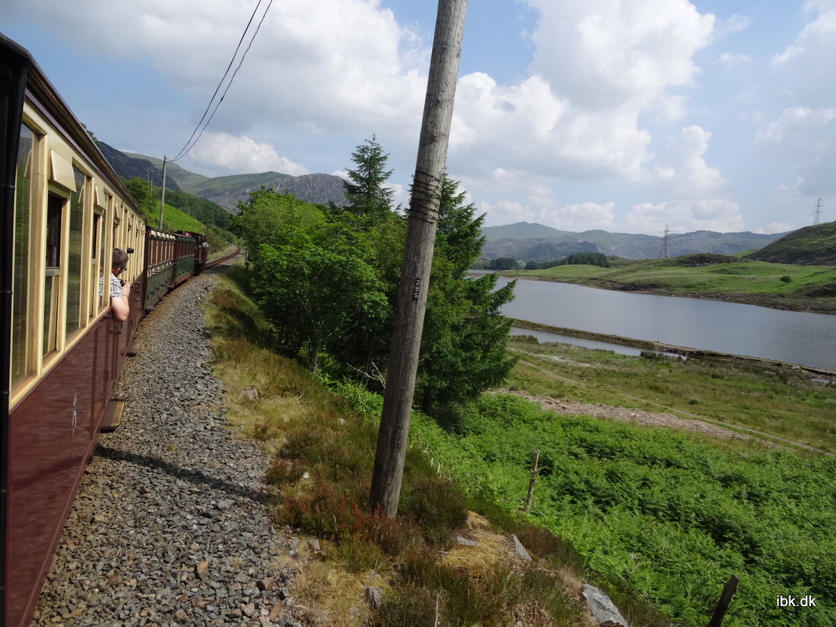 Efter besøget på værkstederne, så gik vi op til det tilhørende trinbræt for Boston Lodge og kort efter kom et af de lokomotiver vi tidligere havde set køre alene ud over dæmningen nu tilbage med et langt tog. Det var det flotte lokomotiv Merddin Emrys , der er et af de specielle Fairlie-type, der har kedel og skorsten i hver ende – nærmest to enheder, der er sat sammen ryg mod ryg. Det giver et flexibelt og kraftigt lokomotiv med stor trækkraft, men stadig kun tomandsbetjent. Der var reserveret en vogn til os, som vi straks indtog og så gik turen ellers gennem endnu et smukt og spændende landskab. Lidt beretning om turen under billederne >>