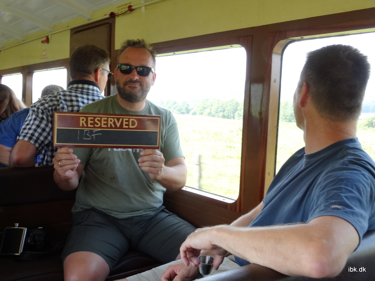 Efter den smukke rejse med Ffestiniog and Welsh highland railway, så fortsatte turen videre til Vale of Rheidol Railway. Den ligger højt oppe ved et storslået vandfald, der løber under Devils Bridge. Vi var der dog ikke for at se på natur men tog, så vi måtte nøjes med at se det i turistbrochuren. Lokomotivet stod klar lige ved indgangen og vi fik en fin sludder med personalet inden de kørte ud og koblede toget på. Stationen bød desuden på god kaffe og var ret hyggelig. Vi havde en forhånds-reserveret vogn. de var af en helt lukket type uden bagperron og kun få af vinduerne kunne åbnes. Det kneb derfor noget for fotograferne at få taget den sædvanlige overflod af fotos – så vi måtte hengive os til at nyde den meget flotte tur på kanten af bjerget med udsigt over dal og flod.