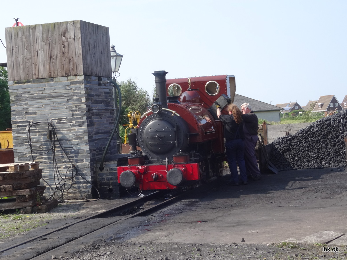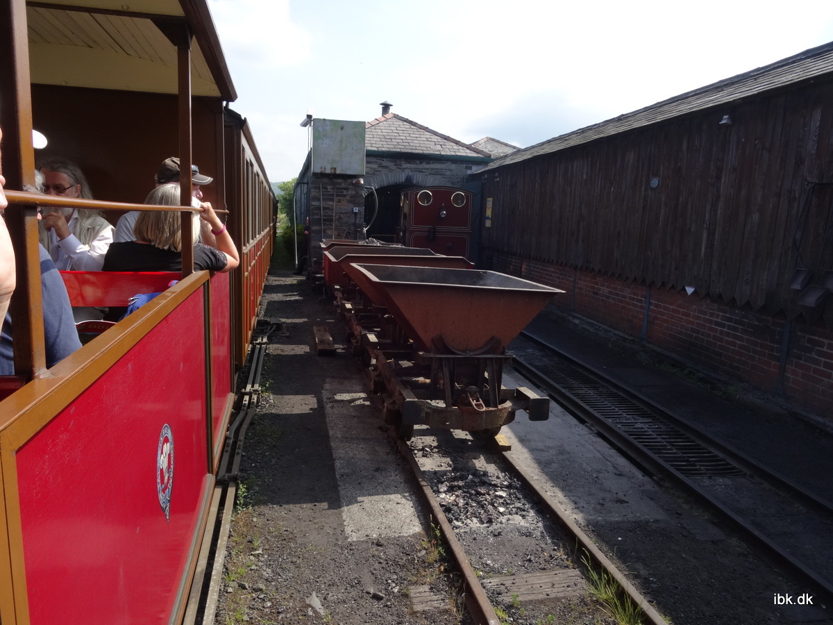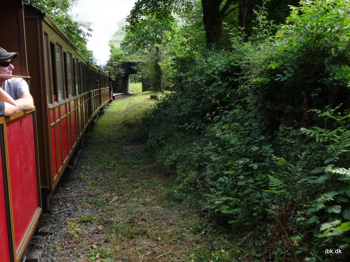 Efter det fine besøg på det lille industribanemuseum var det ved at være tid til turens sidste rigtige togtur, som udgik fra Tywyn Wharf og gik til Abergynolwyn. Vi kunne fint gå rundt på det interessante jernbane – og læsseterræn. Man kunne let forestille sig hvordan området havde været et travlt sted med omlæsning af skifer fra den lille bane til normalsporet. Men denne dag var det mere klargøring og rangering, som vi kunne iagttage. Der var reserveret en lukket vogn til os, men vi var en flok, der i stedet indtog en åben vogn – både fordi det var dejligt vejr, men også fordi det ville give fine fotobetingelser. Toget fløjtede afgang og turen gik straks under en af de mange små broer/ viadukter på turen. Kort efter passerede vi deres værksted og vognhal og derefter gik turen gennem endnu et af de skønne landskaber, som Wales byder på. Første del var relativ flad, men så gik det opad gennem en skov, hvorfra man kunne se langt ud over dalen. Vores tur sluttede dog ikke ved endestationen, da bussen ikke kunne hente os der – og tidsplanen var stram. Vi fik derfor muligheden for at tage et par fotos af afgangen og derefter bevæge os til bussen, som straks begav sig mod lufthavnen. Undervejs gennem en af de mange dale kom et fly tæt over os. Det sker åbenbart ofte læste vi og kunne da også se mange fly-entusiaster stå klar med kameraet. Ved ankomst til lufthavnen fik vi mulighed for at afslutte vores fantastiske togrejse i et moderne gummitog, der kørte os til afgangshallen. Vi var enige om, at de gamle tog har langt mere charme og at det havde været en velplanlagt og fantastisk tur.