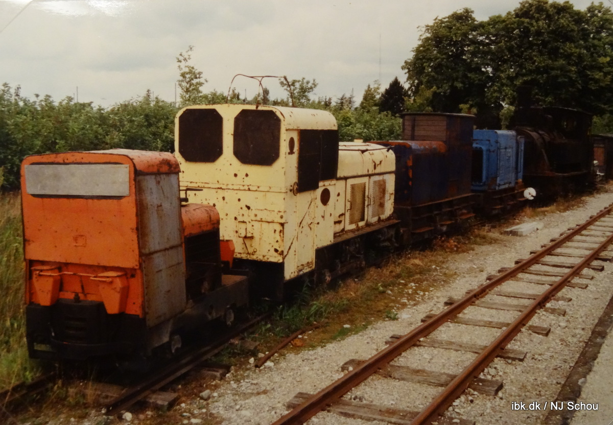 | Den lange række af lokomotiver med 785 mm sporvidde -og et enkelt Simplex på 600 mm. forrest. De er nu alle heldigvis kommet under tag i vognhallen på Brandhøj – bortset fra Faxe V, der stadig er i museumshallens fjerneste hjørne. |