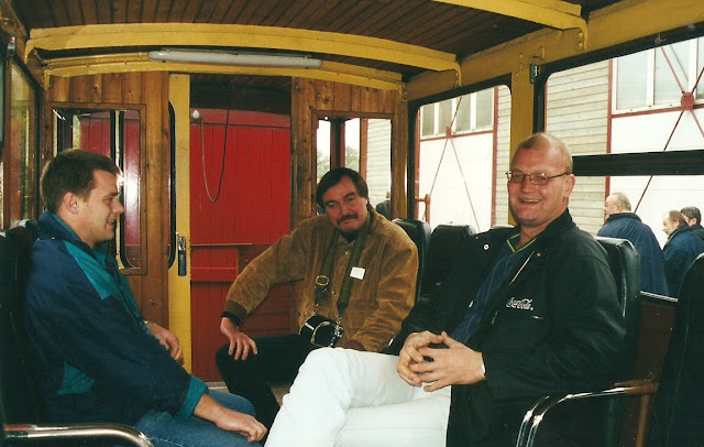 | Det er sjovt at være på træf! Glade klubkammerater i en lukket personvogn på 600 mm. banegården i Froissy, Frankrig. Fra venstre ses Per Adsersen, Henning Dyrkilde og Peter Hein. I et tidligere indslag på bloggen kunne man se hvordan franskmændene skiftede sveller og skinner på en del af deres bane. |