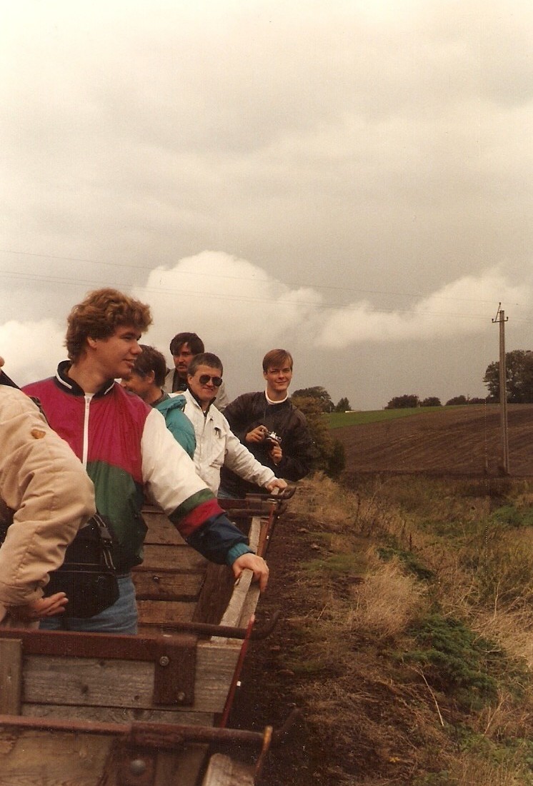 | På Pindstrup Mosebrugs bane i Lille Vildmose er vi her på vej ned ad rampen fra fabrikken i Kongerslev. Vi ser fra venstre: Per Jensens arm, Allan Christensen, Jørgen Panum, Hening Dyrkilde, Carsten Hansen og Steffen Lyngesen med skudklart kamera. |